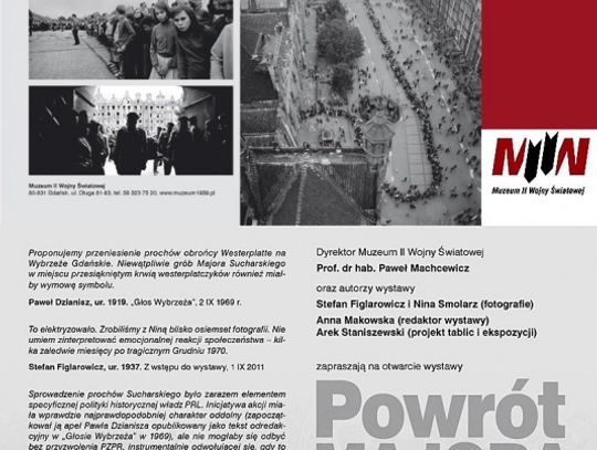 - Wszystko co trudne i odpowiedzialne można rozwiązać tylko razem – powiedział na wernisażu Tadeusz Fiszbach, ówczesny sekretarz do spraw propagandy KW PZPR w Gdańsku, późniejszy sygnatariusz Porozumień Sierpniowych. – Ciężkie to były chwile, ale powinność i obowiązek znajdowały się na pierwszym planie. Miałem kontakt naturalny i bieżący z ludźmi, wiedziałem, co odczuwają - bez korekty i cenzury. Dlatego pojechałem do Gierka i powiedziałem, że trzeba wyrazić zgodę polityczną, żeby sprowadzić prochy majora Sucharskiego, gdyż będzie to pomost między władzą, mieniącą się wtedy ludową, a obywatelami. Chociaż wszyscy pokładaliśmy w Gierku nadzieje, później się to zmieniło, Sprowadzone prochy majora nas zbliżyły do siebie. To nie była manifestacja, to był naturalny patriotyczny odruch powinności wobec bohaterów narodowych.