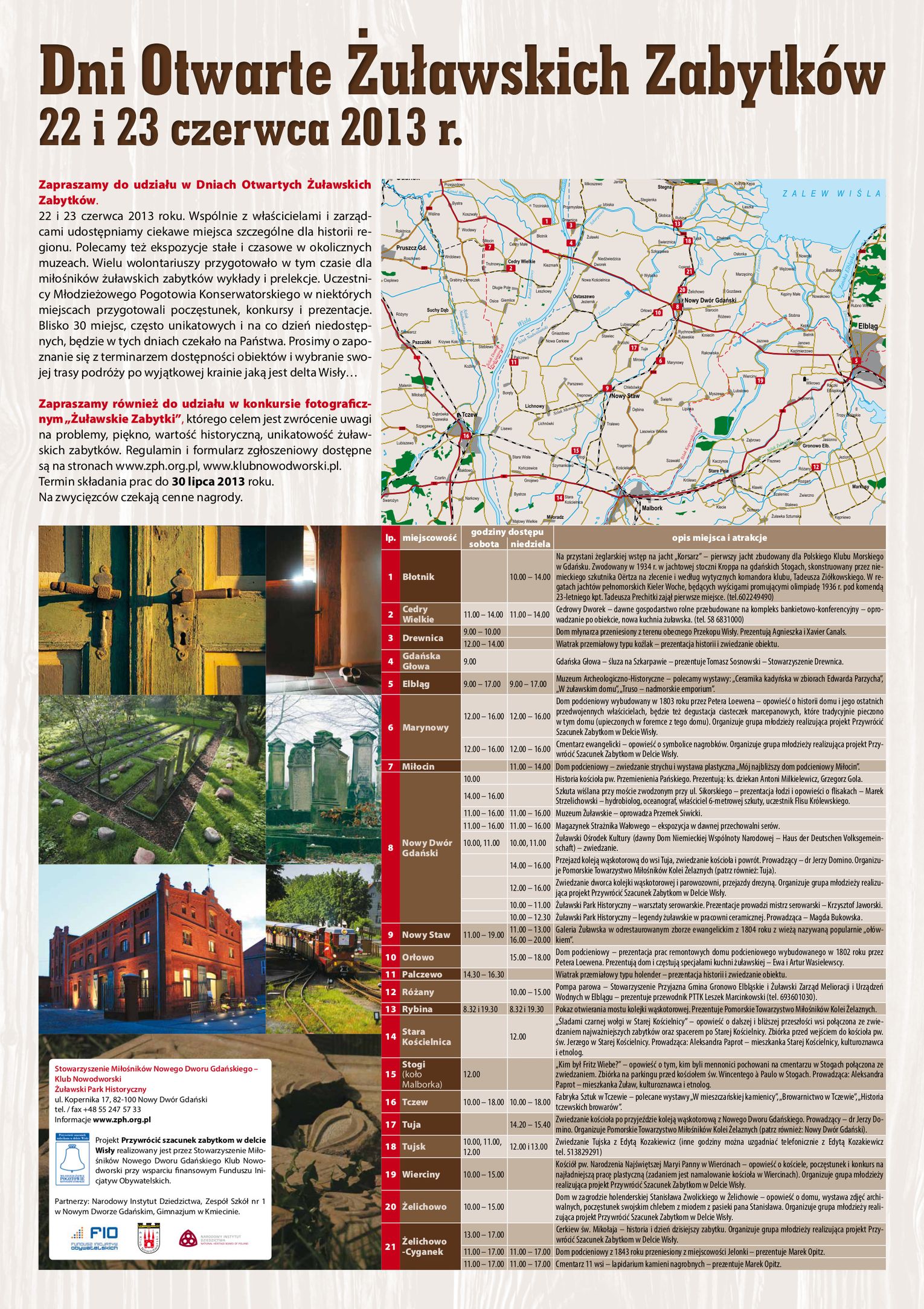 Dom w zagrodzie holenderskiej Stanisława Zwolickiego w Żelichowie – opowieść o domu, wystawa zdjęć archiwalnych, poczęstunek swojskim chlebem z miodem z pasieki pana Stanisława. Organizuje grupa młodzieży realizująca projekt Przywrócić Szacunek Zabytkom w Delcie Wisły.