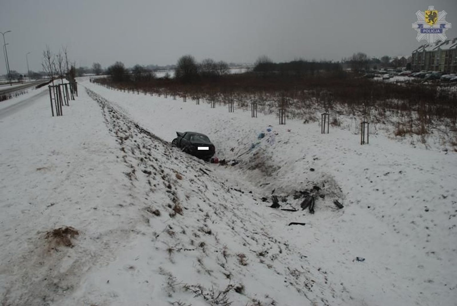 Do wypadku doszło (26 stycznia br.) o godz. 14.10 na skrzyżowaniu ulicy Przemysłowej z ulicą PCK w Pruszczu Gd. Jak ustalili policjanci, 37-letnia gdańszczanka jadąc bmw w kierunku drogi wojewódzkiej nr 226 po wyjściu z łuku jezdni prawdopodobnie wpadła w poślizg. Zjechała na prawy pas ruchu, uderzyła w krawężnik i wjechała do rowu głębokiego na 3,5 metra.