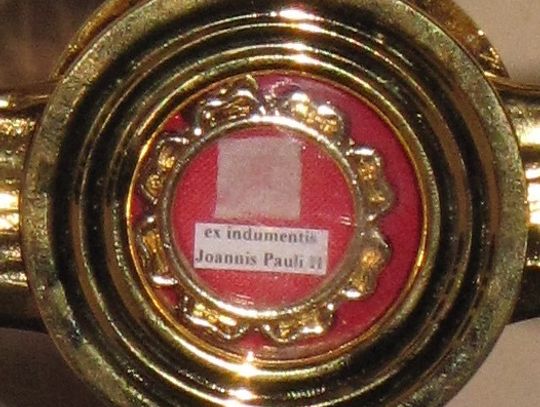 Niewielki fragment sutanny papieskiej z Sali Pamięci Papieskiego Kolegium Polskiego w Rzymie przywiózł ks. Wojciech Korzeniak, wikariusz staromiejskiej parafii. To dar od rektora Kolegium ks. Tadeusza Karkosza. Do sutanny dołączono także specjalny certyfikat podpisany przez ks. Karkosza, poświadczający jej autentyczność.