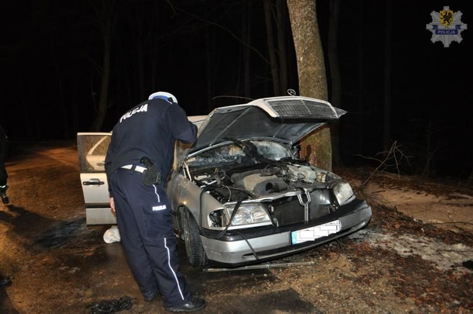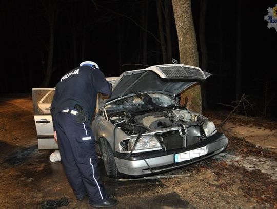 Wczoraj o godz.16.40 dyżurny pruszczańskiej policji odebrał zgłoszenie od policjantów pracujących na terenie gminy Przywidz, iż na ulicy Zwierzynieckiej prowadzącej przez kompleks leśny doszło do wypadku drogowego. Policjanci z komisariatu w Kolbudach, którzy byli na miejscu tuż po wypadku ugasili pożar samochodu, który po uderzeniu w drzewo stanął w płomieniach.