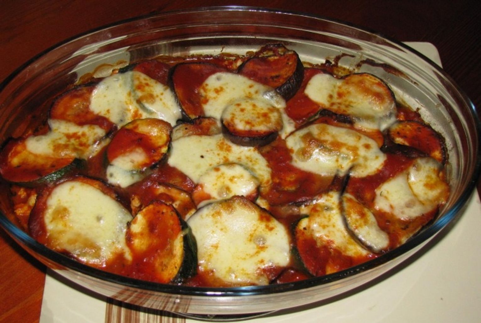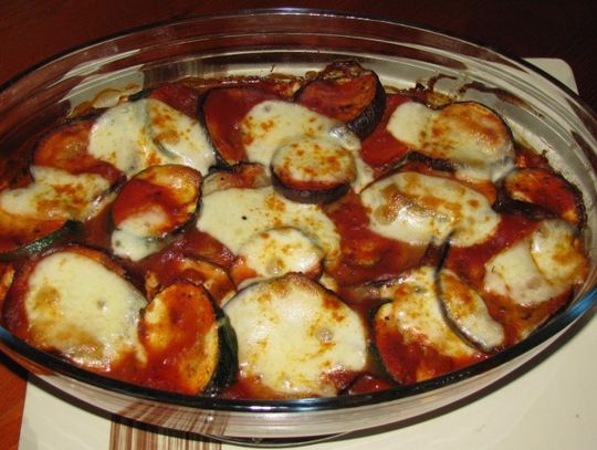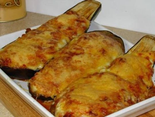 Wykonanie: Bakłażany umyć, obrać cienko, pokroić w plastry o grubości ok.1 cm, a następnie lekko obsmażyć na oleju. Zrumienione plastry bakłażanów popruszyć solą i pieprzem. Jaja wbić do miski i ubijając wymieszać z utartym serem i mlekiem. Posolić. Podsmażone bakłażany ułożyć w żaroodpornym naczyniu, zalać mieszaniną przygotowaną z jaj i zapiec wstawiając do nagrzanego piekarnika. Podawać od razu w tym samym naczyniu. Posypać posiekaną zieleniną. Przyrządzając sos, czosnek drobno posiekać, wymieszać z koncentratem pomidorowym, dodając po łyżce olej lub oliwę. Przyprawić sos do smaku solą, cukrem i pieprzem, podając w sosjerce.