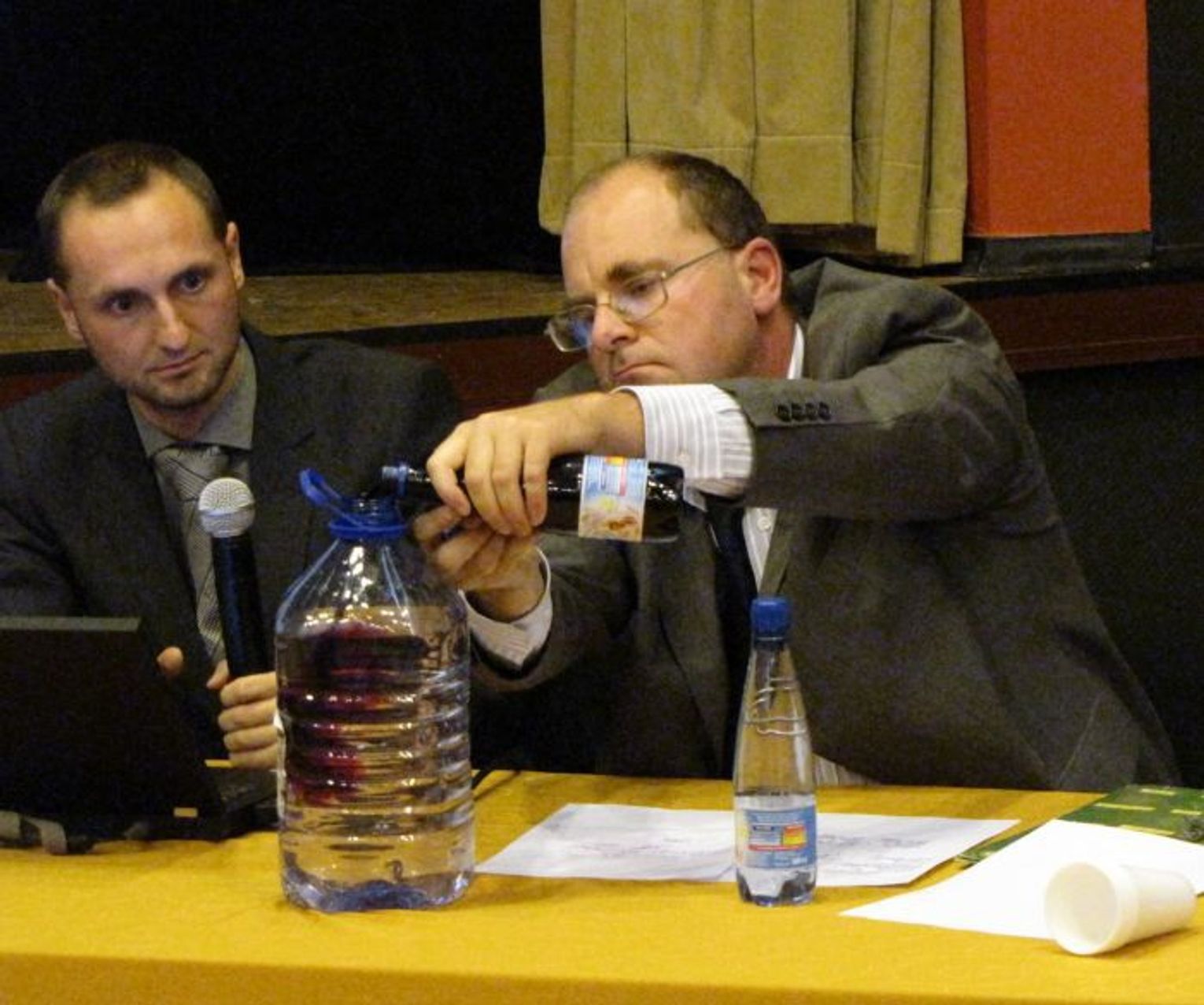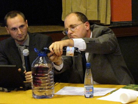 Dr Pazderski przy pomocy wody i nadmanganianu potasu zaprezentował, w jaki sposób szkodliwe emisje będą się „rozcieńczać” w powietrzu. Stwierdził też, że w raportach środowiskowych brakuje wszystkich pomiarów dwutlenku siarki.