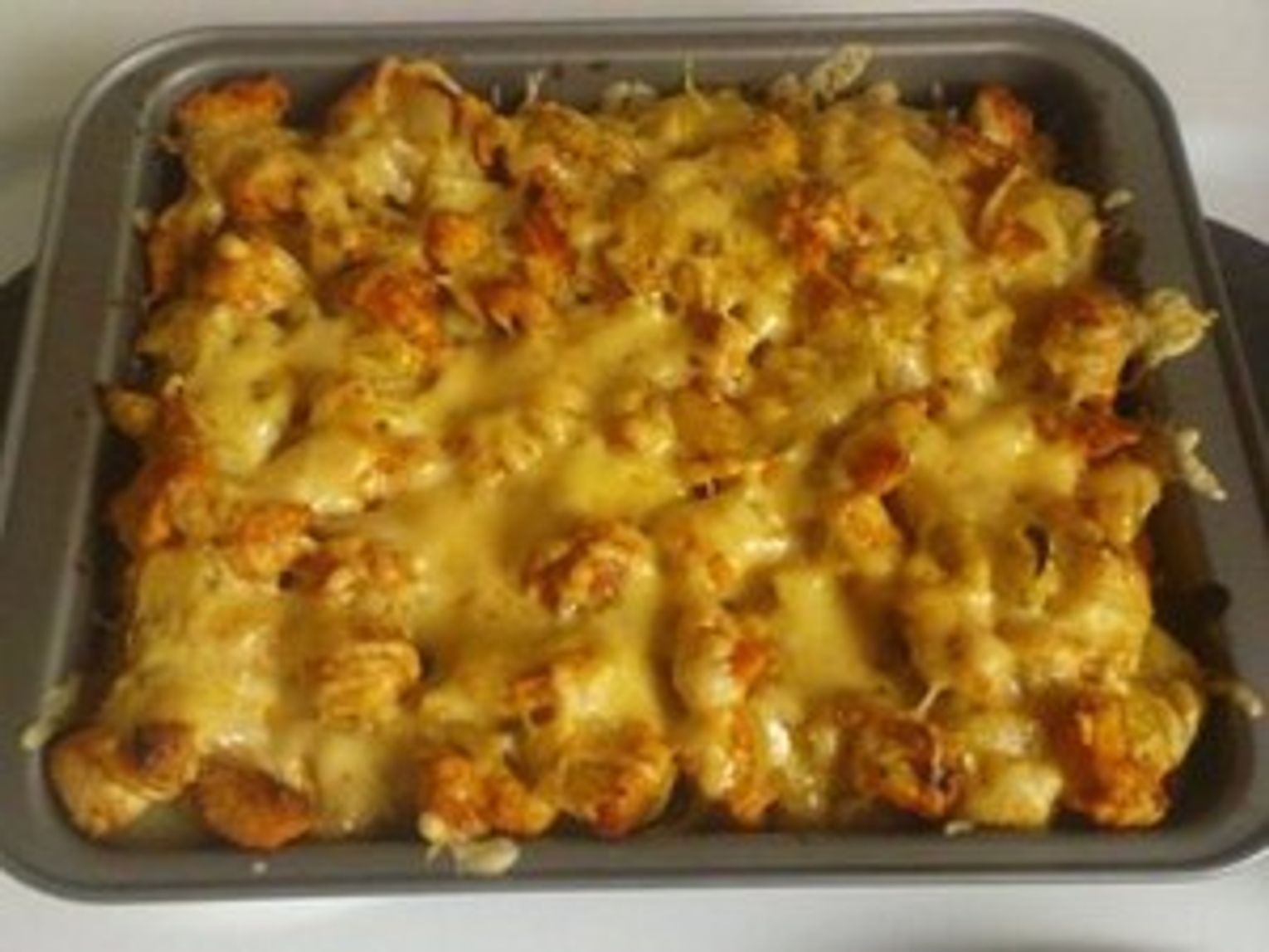 Wykonanie: Włoszczyznę umyć i pokroić. Filety opłukać, osuszyć. Mięso i warzywa zalać wodą, gotować, aż mięso będzie miękkie. Pod koniec gotowania przyprawić solą i pieprzem. Ryż ugotować na sypko w osolonej wodzie, odsączyć, przestudzić. Na patelni rozgrzać olej, włożyć ryż, rozdrobnione mięso, dodać przyprawy. Smażyć przez kilka minut, często mieszając. Zdjąć patelnię z ognia. Groszek odsączyć z zalewy, marchewkę wyjąć z rosołu, pokroić w kostkę. Do ryżu dodać groszek i marchewkę. Wszystko razem wymieszać, przełożyć do natłuszczonego, żaroodpornego naczynia. Polać potrawę kilkoma łyżkami rosołu, wierzch posypać startym serem. Zapiekać 15 min. Można podawać w naczyniu, w którym przygotowałyśmy zapiekankę.