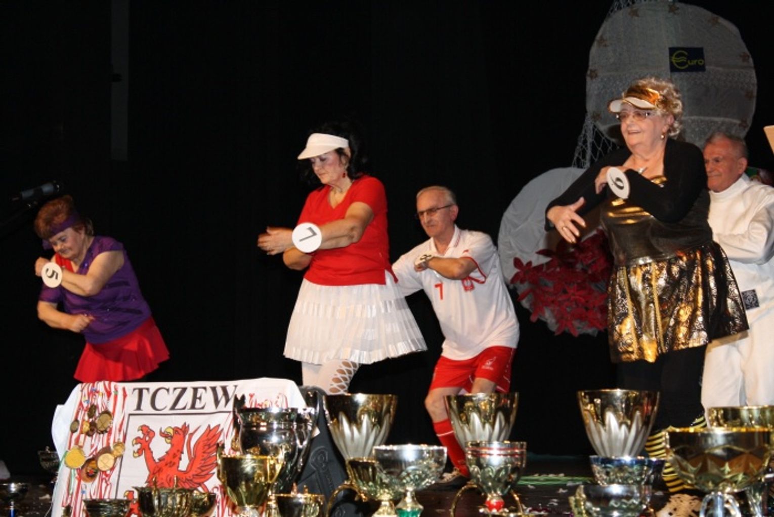 To było w pierwszej części sportowej. W drugiej tczewscy aktywni seniorzy, czyli nasze asy, popisywali się nie tylko w kolejnych sportowych dyscyplinach, ale też znajomością języków obcych. Kto nie widział snowboardu, poczwórnego (pierwszego w historii wykonanego przez kobietę) toeloopa na tafli lodowej, niech żałuje.
