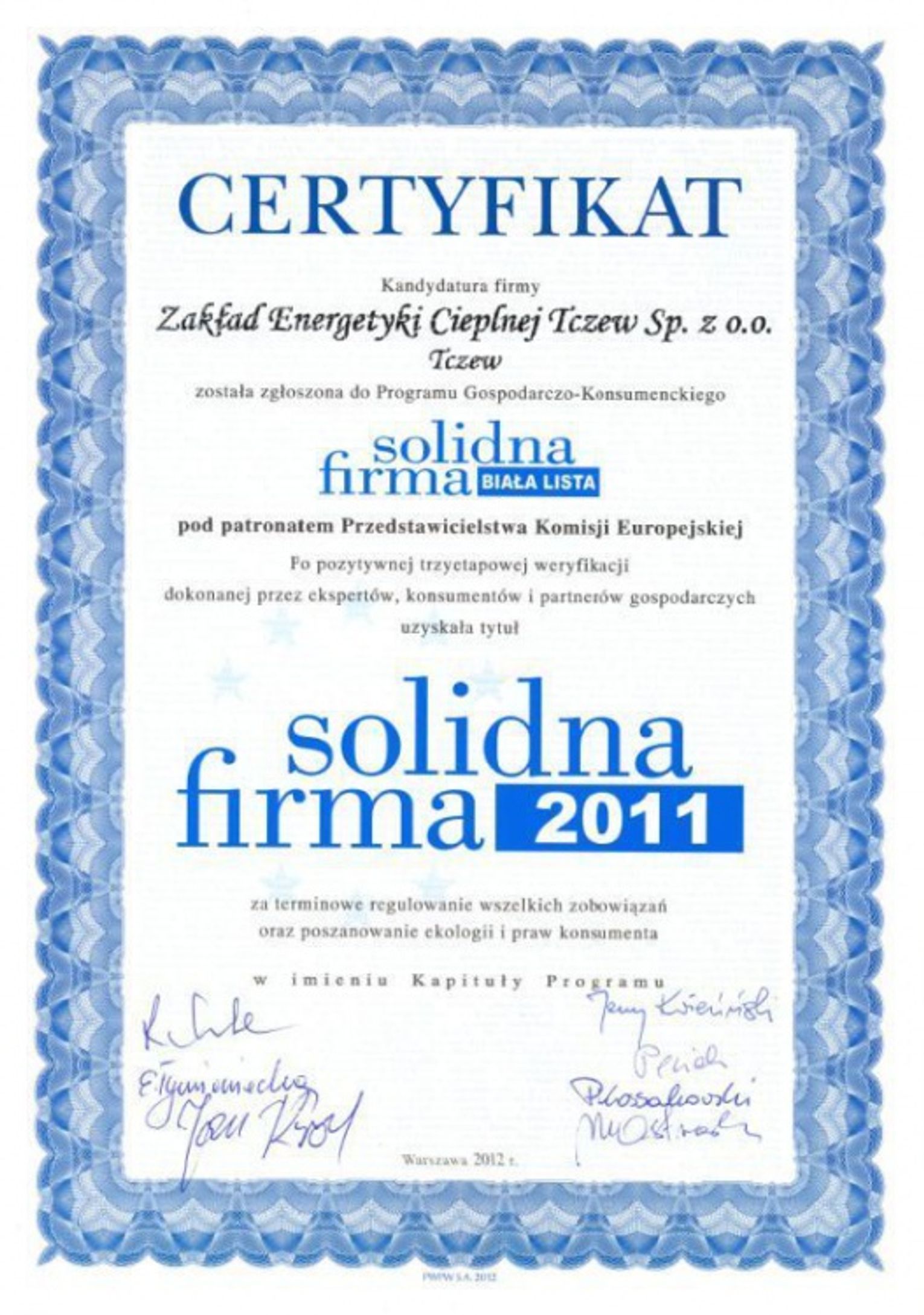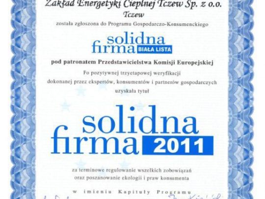 - Tytuł „Solidna firma” - to dla spółki specjalne wyróżnienie poświadczające naszą rzetelność i wiarygodność, to podsumowanie pracy całej załogi – stwierdza Barbara Stanuch prezes zarządu ZEC Tczew Sp. z o.o. - Spółka przeszła długi i wieloetapowy proces weryfikacji zwieńczony otrzymaniem tego prestiżowego certyfikatu. Przy okazji gratulujemy pracownikom wszystkich spółek.