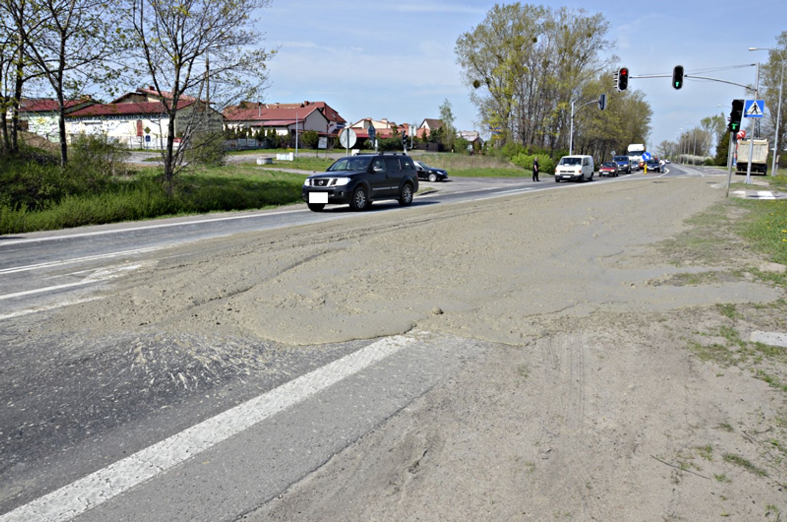 Dzisiaj około godziny 13.50 w Tczewie na skrzyżowaniu ul. Norwida i drogi krajowej nr 91 wylała się z ciężarówki substancja przypominająca beton.