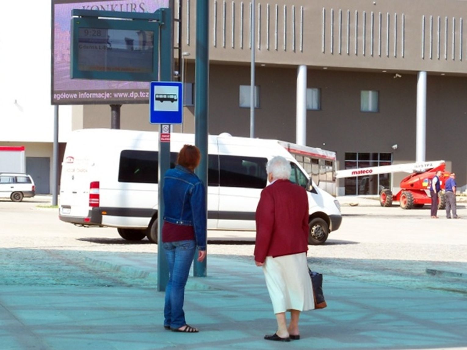 Pani jest spoza Tczewa. Dopytuje inną kobietą czy czeka we właściwym miejscu. Dwa przystanki dalej, druga starsza pani zwraca się o pomoc do młodej osoby. Ta robi „daszek” nad oczami, by patrząc pod słońce zobaczyć co jest na elektronicznej tablicy.