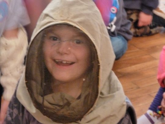 Szczęściarzom udało się nawet przymierzyć kapelusze pszczelarskie. Dzieci słuchały, smakowały, przymierzały i zadawały pytania.