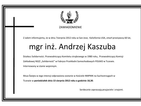 Jak nas poinformowali Tadeusz Wilczarski z Tczewa i Zdzisław Stachowicz- mieszkający na emigracji w Kanadzie, w dniu 7 sierpnia 2012 roku w San Jose (USA), w wieku 60 lat, zmarł nagle Andrzej Kaszuba - legendarny przywódca strajku w sierpniu 1980 roku i pierwszej "Solidarności" w Fabryce Przekładni Samochodowych "Polmo" w Tczewie. Andrzej Kaszuba po internowaniu 13 grudnia 1981 r. został zmuszony przez komunistyczny aparat bezpieczeństwa do emigracji z Ojczyzny. W USA przebywał od samego początku emigracji.
