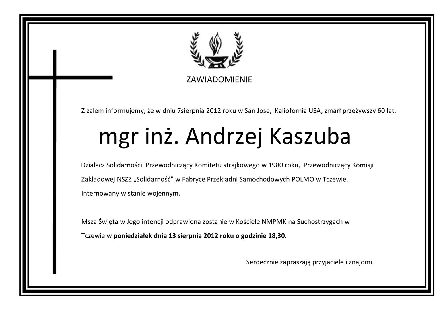 Msza święta za Duszę zmarłego Andrzeja Kaszuby odbędzie się w poniedziałek 13 sierpnia 2012 r. o godz. 18.30 w kościele Najświętszej Marii Panny Matki Kościoła w Tczewie przy ul. Rokickiej na Suchostrzygach.