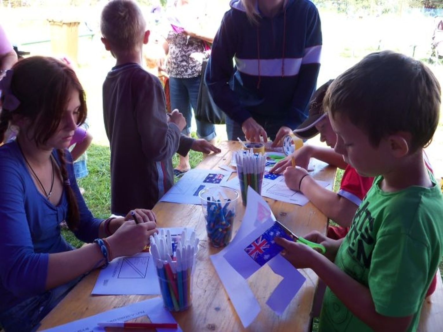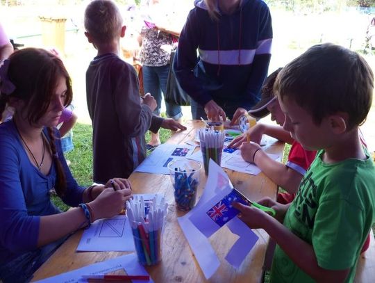 Tym razem wspólna zabawa miała miejsce na boisku naprzeciwko kościoła na os. Staszica. Obok dzieci, które przyszły z mamą czy babcią, były dwie grupy półkolonistów i grupa z pobliskiego przedszkola. Jak zawsze było sporo zabawy z wycinaniem, malowaniem. Poznawano zwierzęta, malowano flagi państw, często dla dzieci o egzotycznym brzmieniu jak np. Kiribati. Były maoryskie wzory, eukaliptusowe drzewka itd.