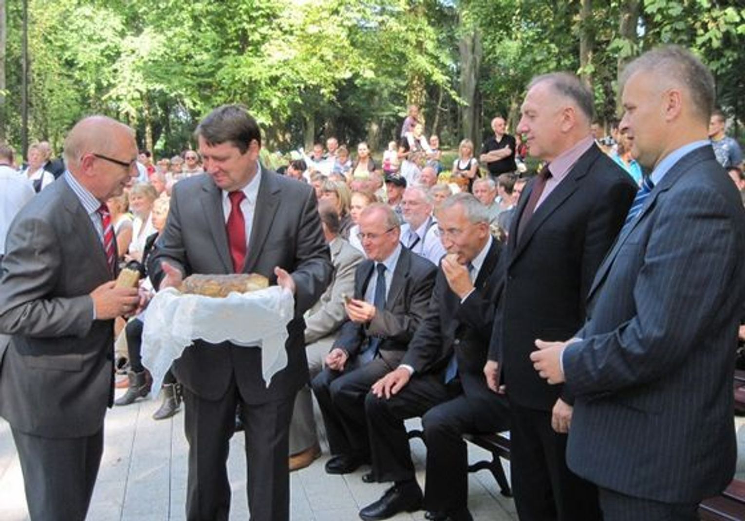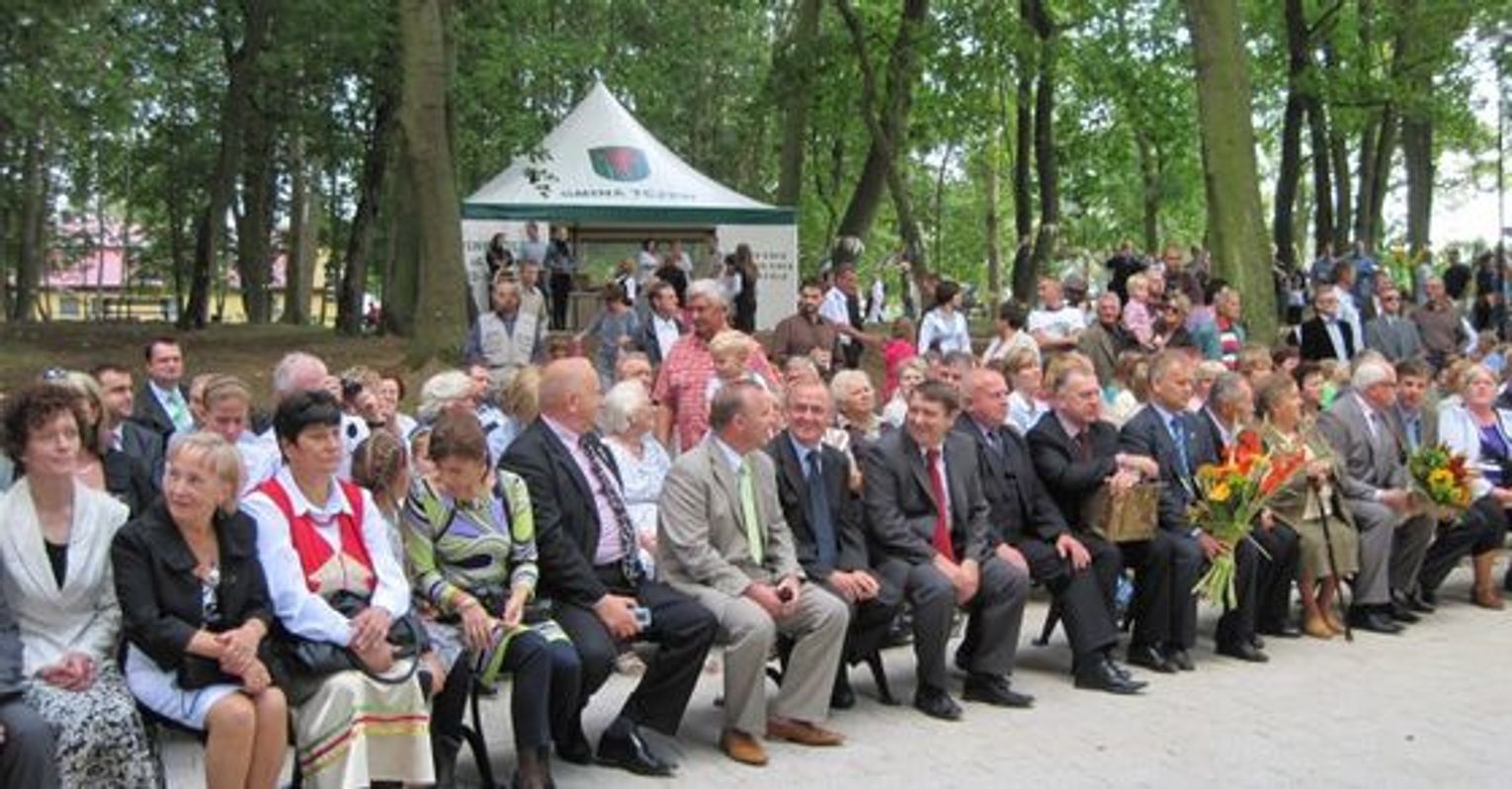 Wójt odczytał list od marszałka woj. pomorskiego, a następnie przystąpił do dzielenia upieczonego przez panie z kół gospodyń wiejskich chleba. Rozdał go zebranym, bo ten zjedzony symboliczny chleb dożynkowy pozwala wierzyć, że nikomu go do następnych żniw nie zabraknie. Starosta tczewski Witold Sosnowski gratulował wójtowi i samorządowi intensywnego rozwoju gminy i dużej ilości inwestycji, czego kolejnym z przykładów jest właśnie oddany park w Turzy (scena, ławki, alejki, oświetlenie itd.). Roman Rezmerowski przypomniał, że nie byłoby tego pięknego miejsca, gdyby nie duży wysiłek nie tylko firmy wykonawczej, ale też i samych mieszkańców gminy, którzy sami uczestniczyli w pracach (często do późnych godzin wieczornych), by zdążyć na czas uroczystości dożynkowych.