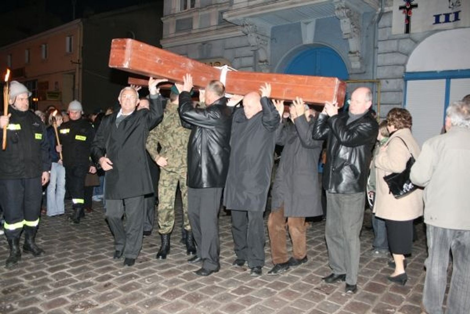 Stacja trzecia Jezus upada po raz pierwszy pod ciężarem krzyża. Krzyż przejęli wówczas radni miejscy.