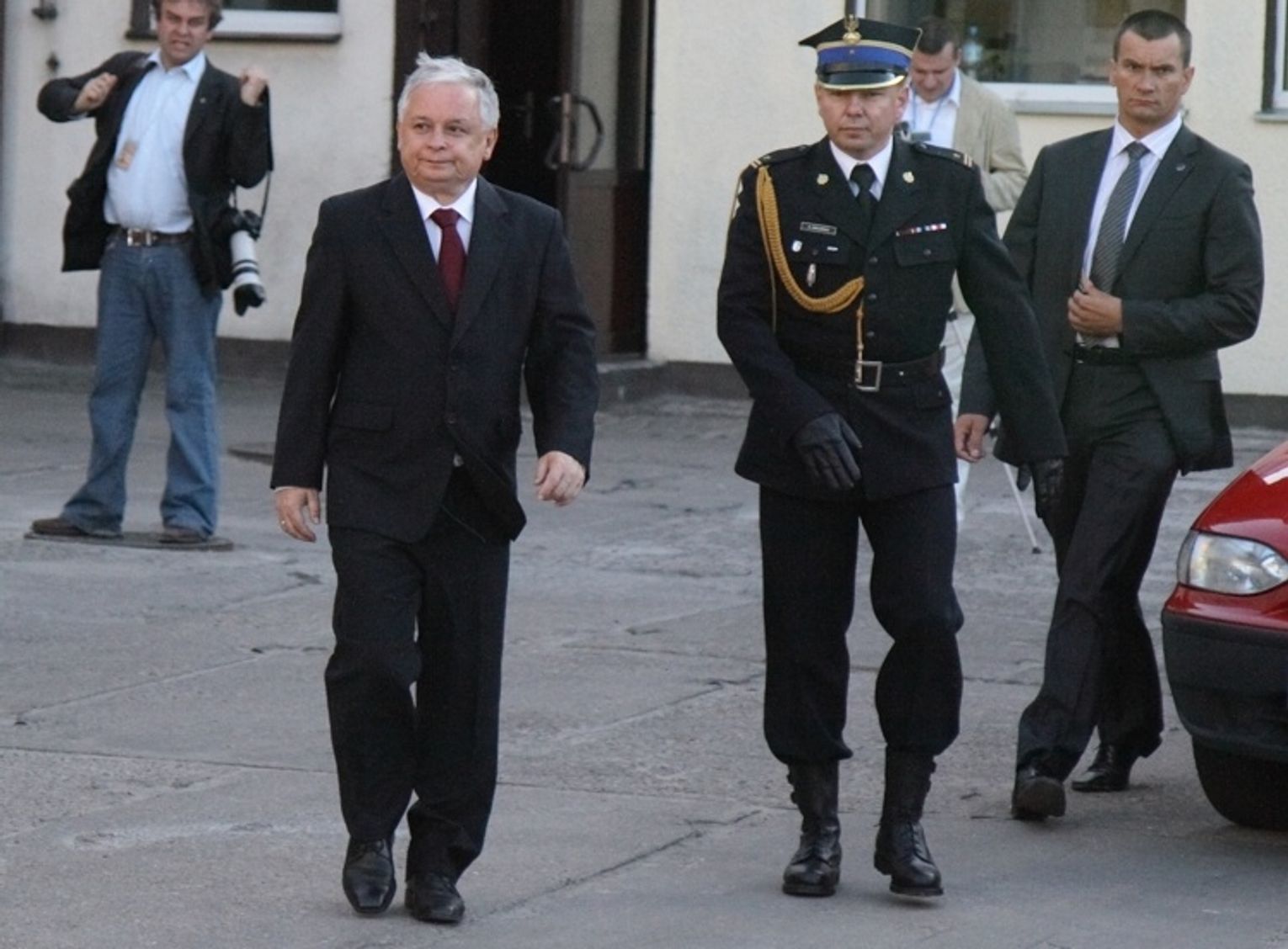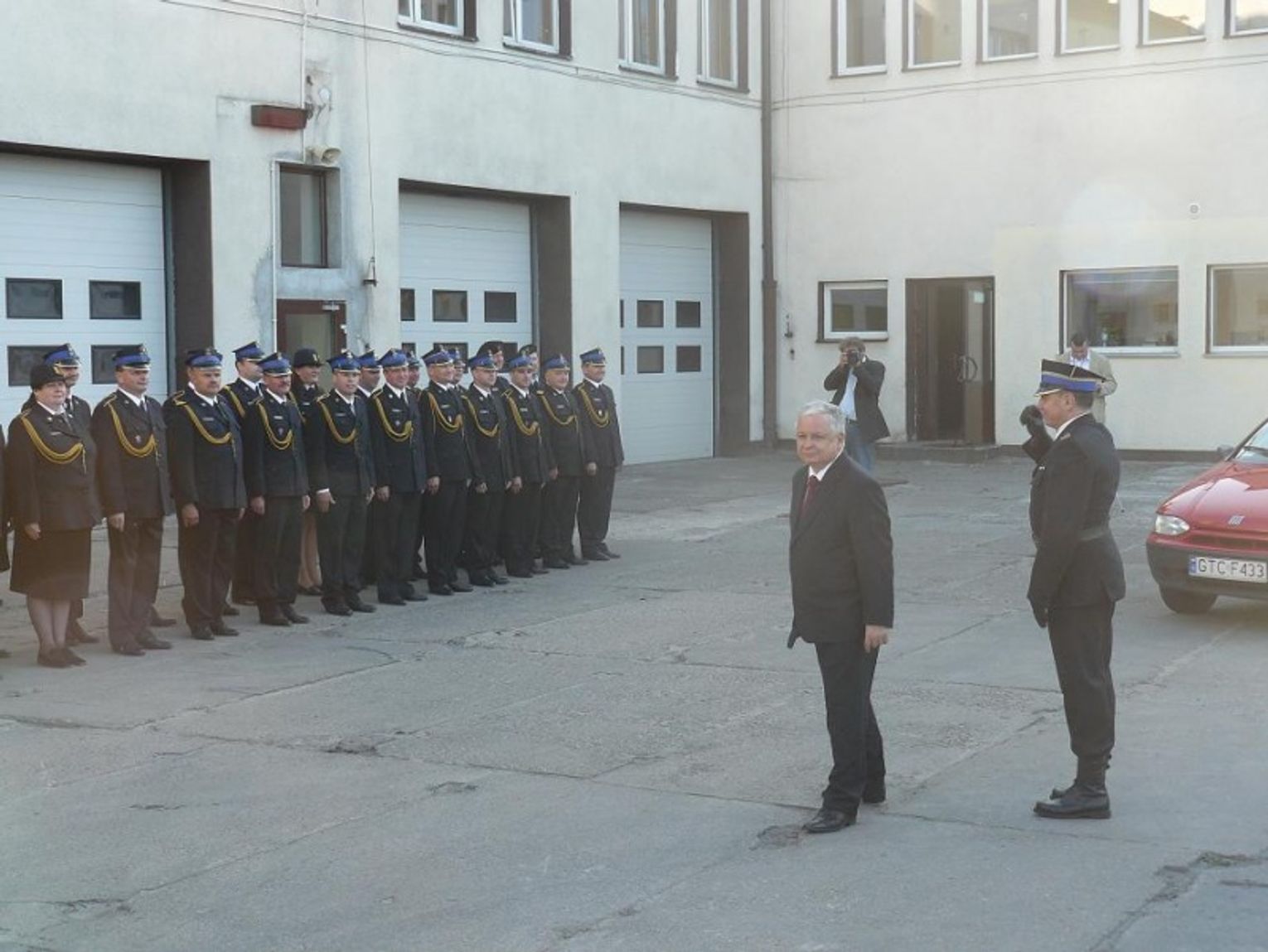 Prezydent przyjechał do Tczewa spóźniony o prawie godzinę w stosunku do pierwotnego planu wizyty. Jak tłumaczyli organizatorzy przyjazdu, przeciągnęły się obchody 75-lecia Skórcza, w których Lech Kaczyński również brał udział. Krótkie spotkanie z tczewskimi strażakami rozpoczęło się od złożenia przysięgi i wpisu do księgi pamiątkowej. W prezencie od wojewódzkiego komendanta Państwowej Straży Pożarnej bryg. Andrzeja Rószkowskiego prezydent otrzymał tabakierę, a od komendanta powiatowego bryg. Waldemara Walejko strażacki kordzik. Przedszkolacy z Przedszkola nr 8 z kolei, z jedynej takiej w kraju ochotniczej straży pożarnej, wręczyli głowie państwa biało-czerwone róże. Pierwszy punkt pobytu Lecha Kaczyńskiego w grodzie Sambora zakończyło złożenie wieńca pod tablicą na ul. Lecha, upamiętniającą rozstrzelanych w 1940 r. przez hitlerowców trzynastu tczewian.