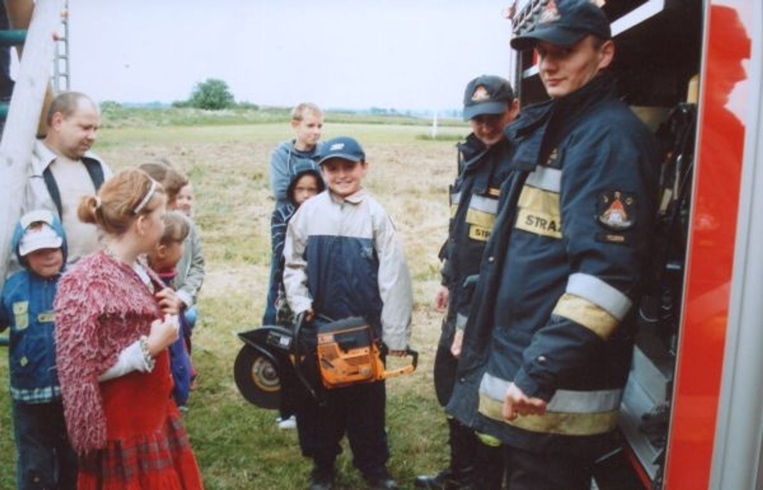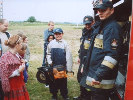 Wszystko to jednak nic w porównaniu z tym co się działo, gdy przyjechał prawdziwy, olbrzymi (zdaniem maluchów), wypasiony w pompy, sikawki, węże i coś tam jeszcze wóz strażacki. Jak mrówki swój kopiec, tak dzieci obsiadły pojazd. Panowie strażacy dwoili się i troili, by wszystko pokazać, omówić, wyjaśnić. Zdjęciom w hełmach strażackich na wozie i przy nim nie było końca. No i nie mogło zabraknąć lania wody z prawdziwej sikawki.