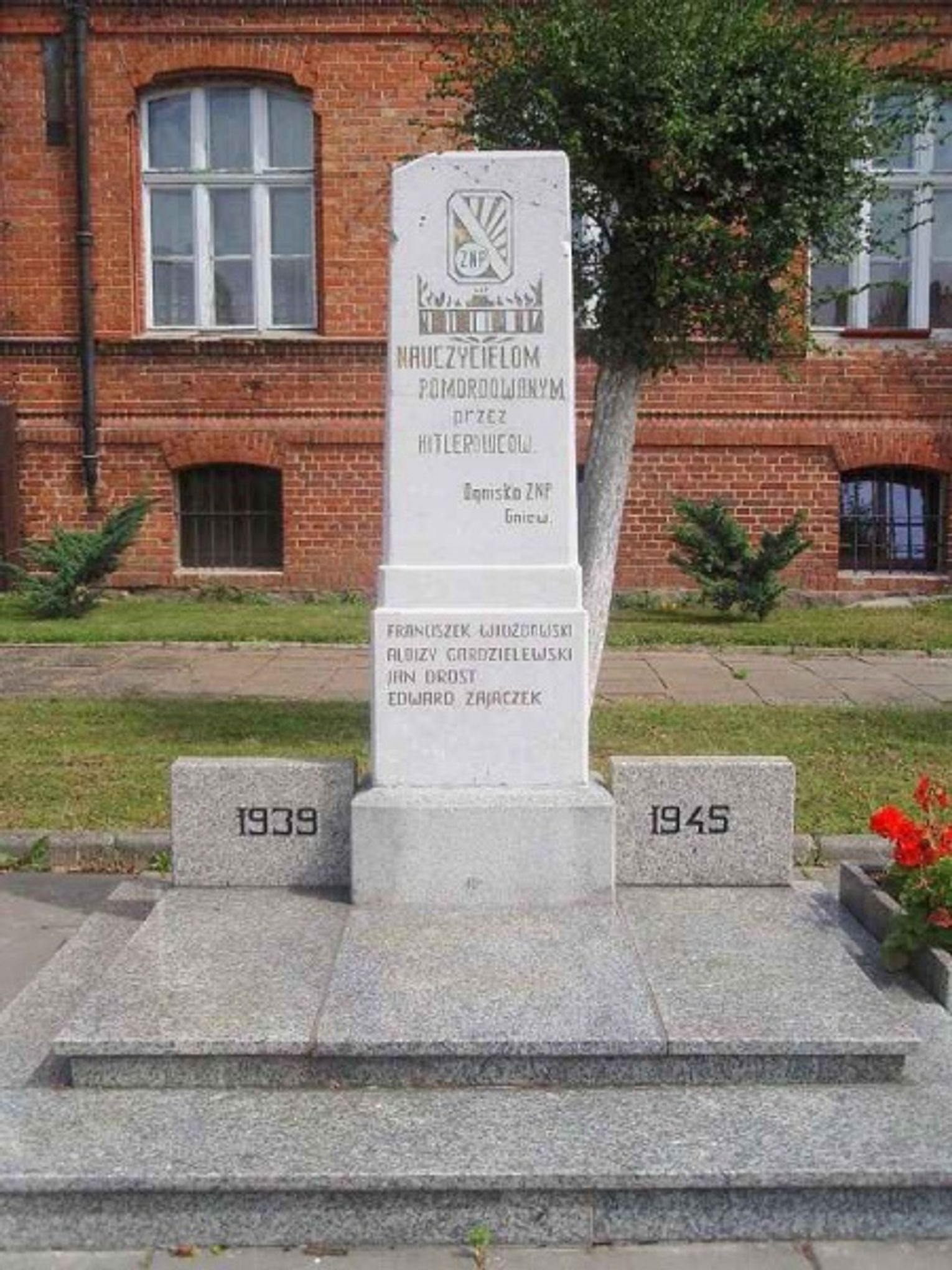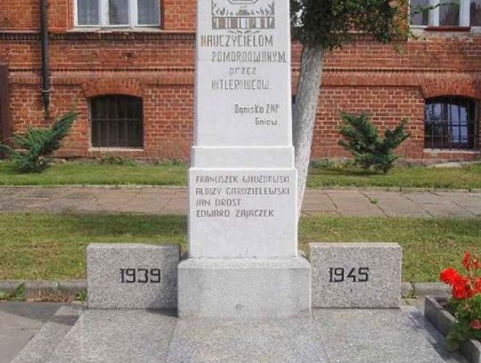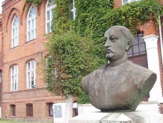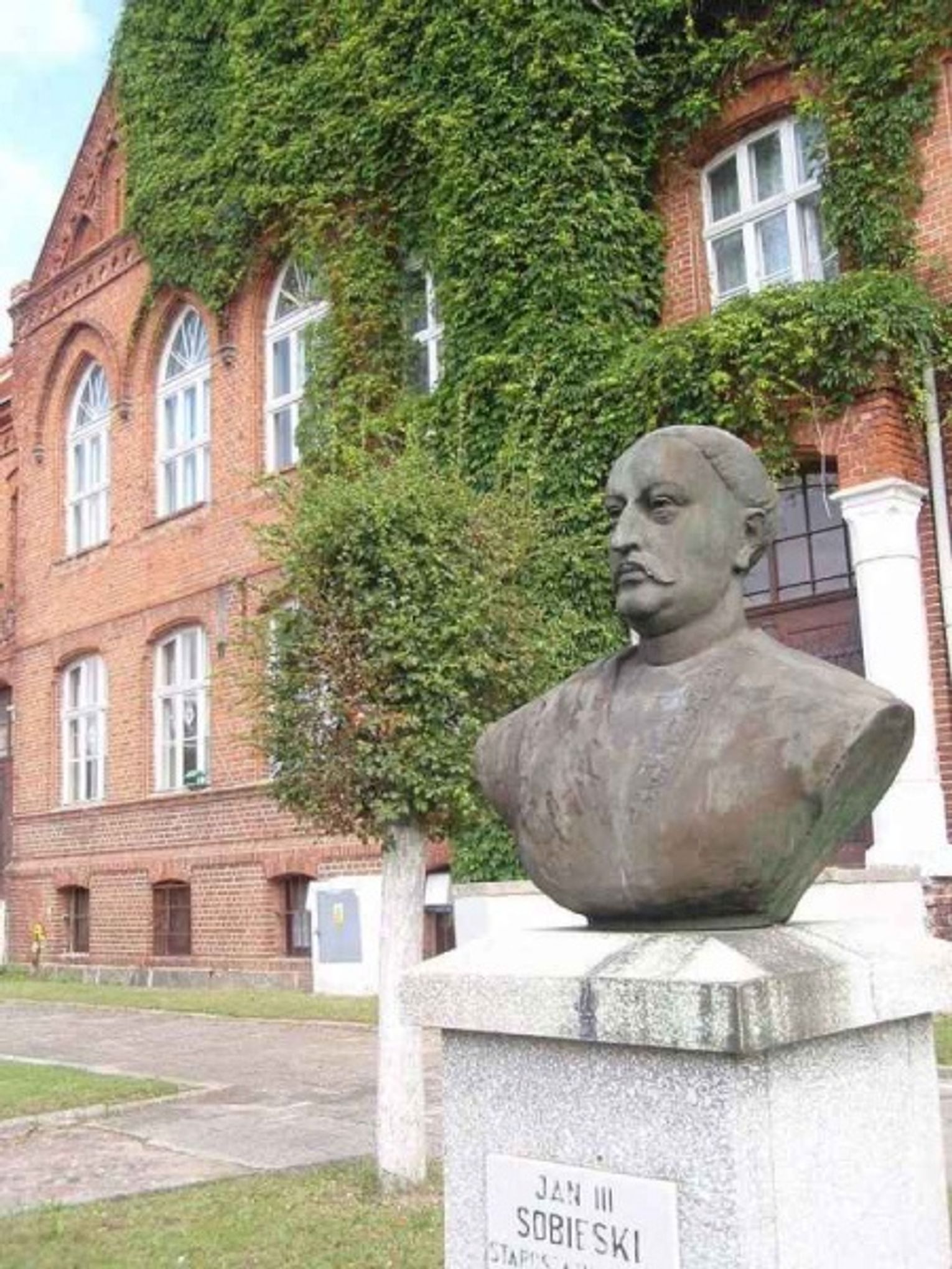 Przed budynkiem - popiersie patrona szkoły oraz obelisk ku czci nauczycieli zamordowanych przez hitlerowców. Przy nim bukiet czerwonych kwiatów. Po szerokich, betonowych schodach podchodzimy pod szkołę. W kilku oknach widzimy panie, które czyszczą okienne szyby.