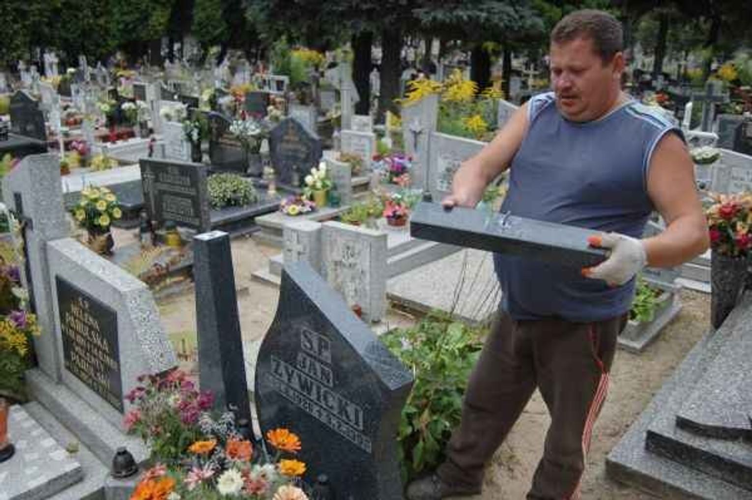 Pracownicy opiekujący się cmentarzem do wtorku, 11 sierpnia, „posklejali” już dużo nagrobków.