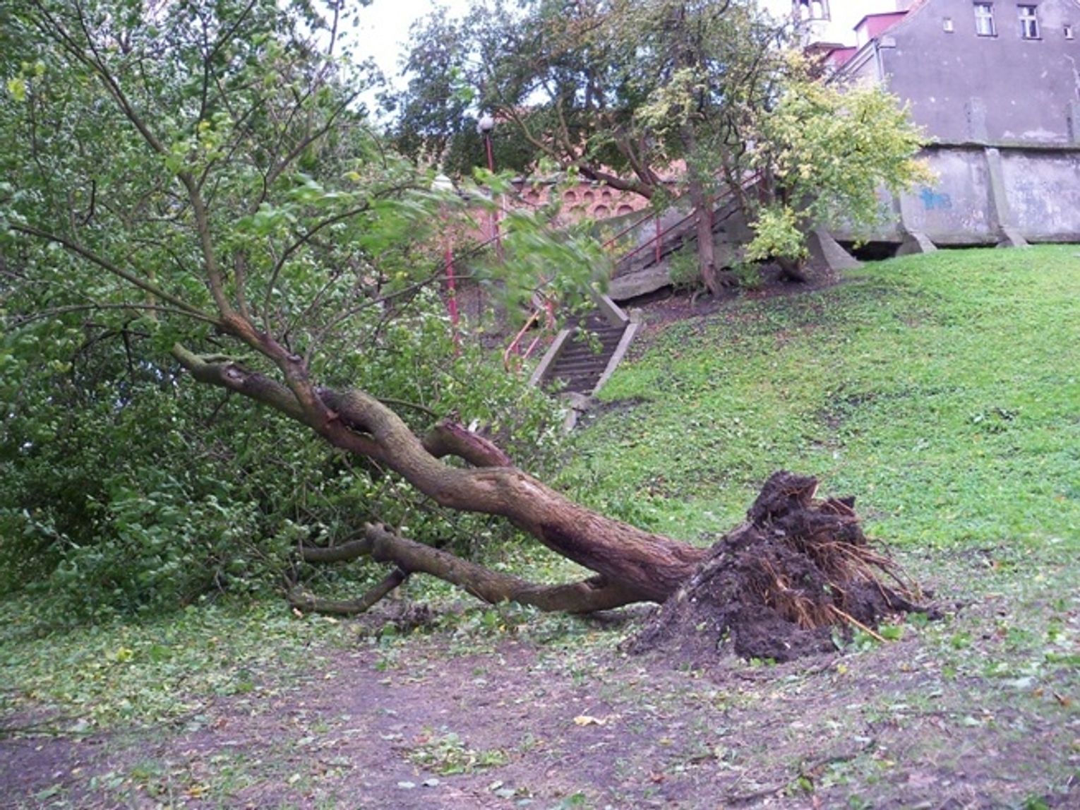 Z kolei na ul. Gdańskiej ok. godz. 11.00 wichura wyrwała drzewo z korzeniami na skrzyżowaniu z ul. Sadową. Zapobiegawczo wycięto znajdujące się po drugiej stronie jezdni kolejne dwa drzewa... a potem jeszcze jedno. Powalone na jezdnię drzewa zablokowały jakikolwiek ruch. Chwała dla strażaków, że nie czekając na dalsze „wyczyny” wichury, wycieli profilaktycznie drzewa trzy drzewa, które i tak prawdopodobnie by się zwaliły na jezdnię.