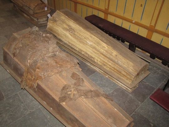 Po odsłonięciu wejścia do krypty, zamurowanego po 1850 r. lub jeszcze w XX wieku, oczom archeologów ukazało się sześć dobrze zachowanych trumien i rozsypane na posadzce kości.