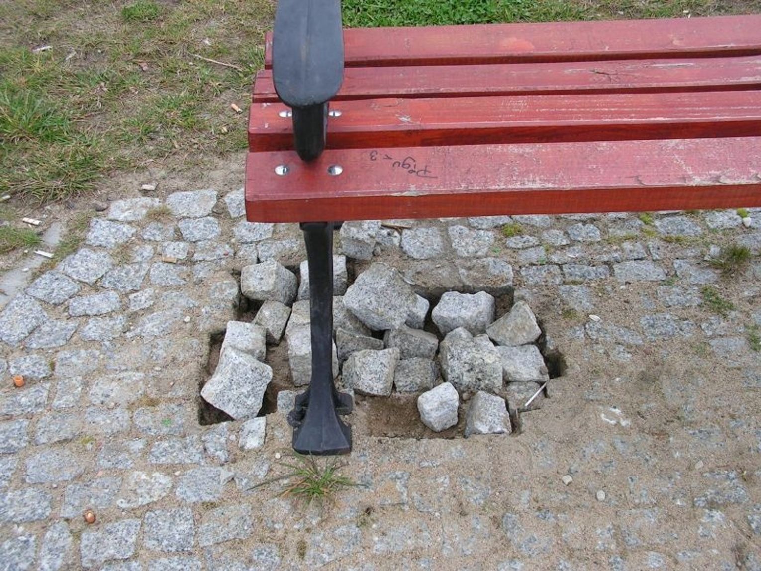 Sprawdziliśmy sygnał. Wszystko się zgadza. W kilku miejscach (zwłaszcza przy ławkach) brakuje kilkunastu kostek. Są też pojedyncze braki. Ktoś „wyskrobał” kostkę na ścieżce rowerowej w pobliżu lampy przy głazie z napisem „150 lat mostu tczewskiego”. Urwana jest belka od huśtawki, popisane i poniszczone elementy ciuchci.
