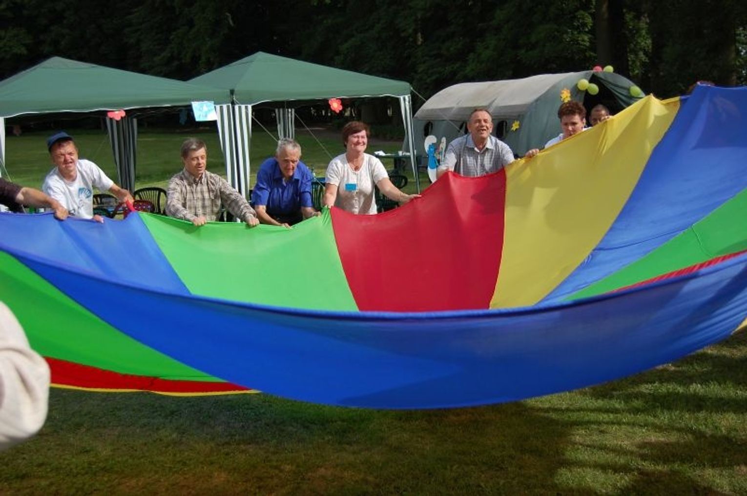 Sporo emocji wzbudziła „zabawa z chustą”. Była nią duża kolorowa płachta materiału z otworem po środku. Zabawa polegała na wspólnym podrzucaniu piłki aż ta wpadnie do otworu.