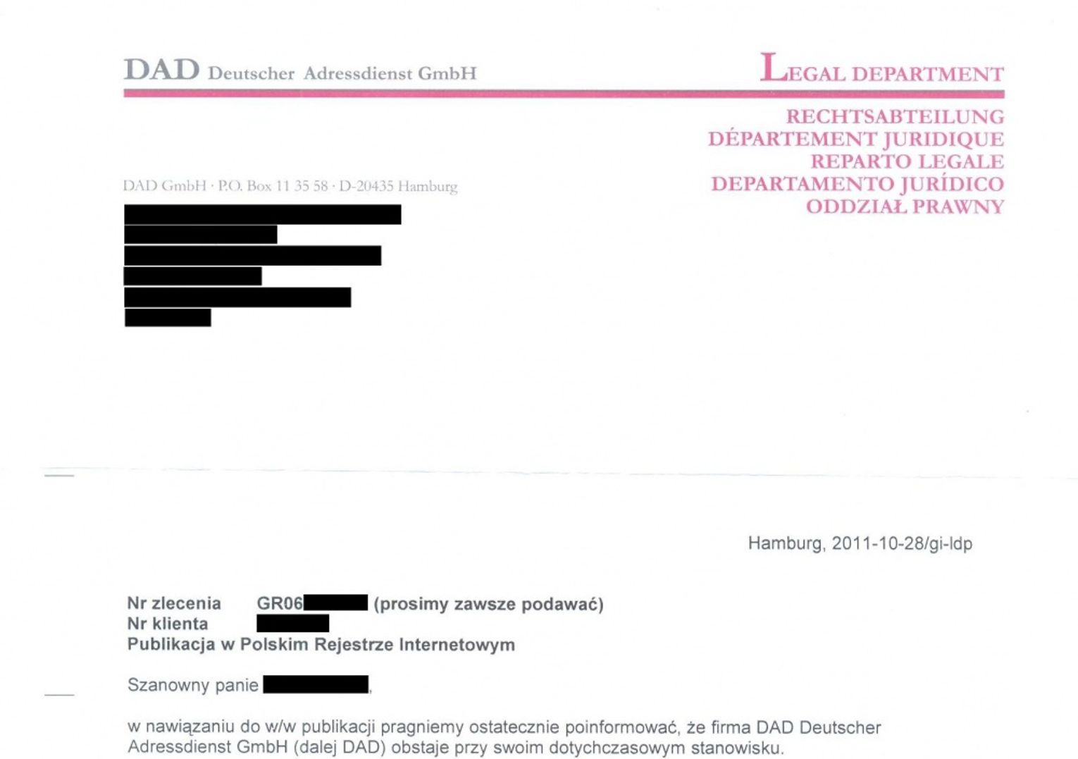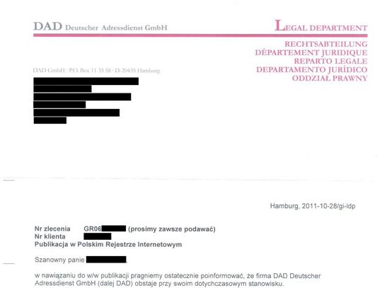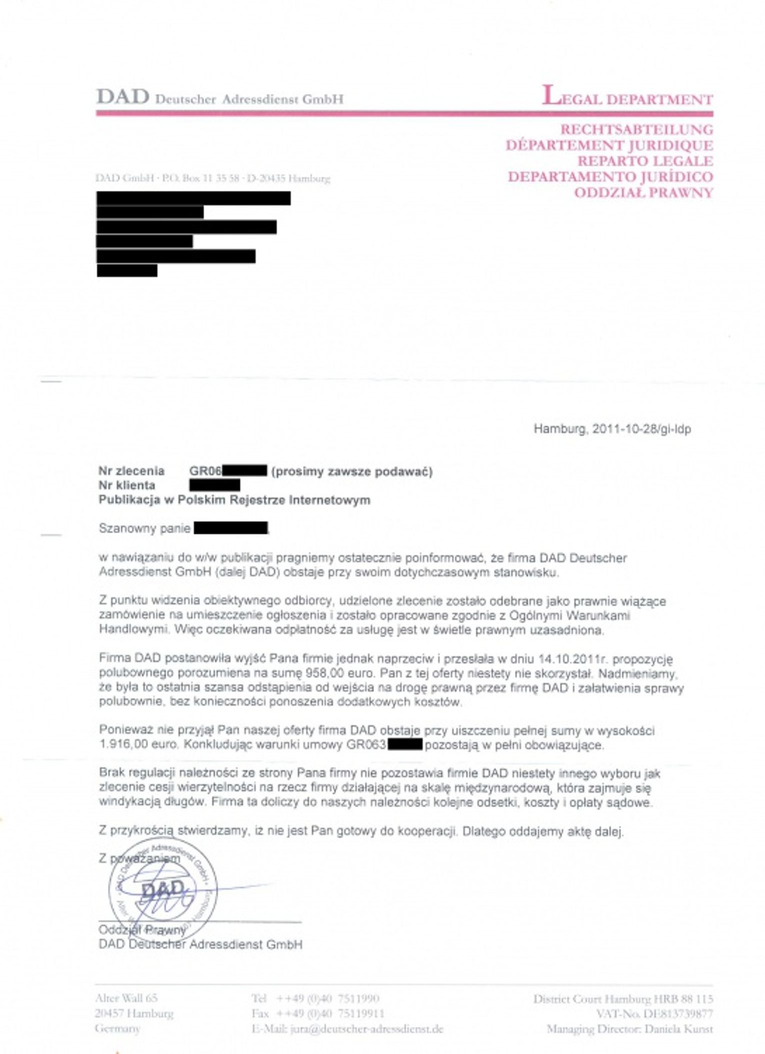 Zrezygnowanie z usługi jest trudne, jak również kontakt z samą firmą, która mieści się w Hamburgu. Firma bowiem dała znać o sobie 09.07.2008 r.. W nadesłanym piśmie czytamy: „państwa akta zostały przekazane do naszego działu prawnego, ponieważ uchylają się państwo od spełnienia zobowiązań płatności z w/w zlecenia, pomimo licznych monitów o płatności.”