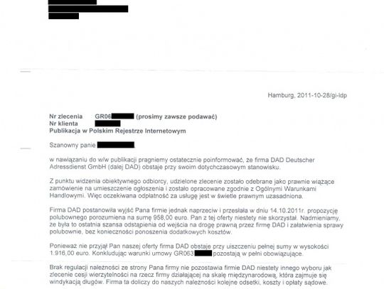 Niestety 14 października br. niemiecka firma przysłała polubowne zakończenie w postaci opłaty jednej faktury. Polski właściciel przedsiębiorstwa nie odpowiedział na to, co skutkowało ponownym pismem kilka dni później.
