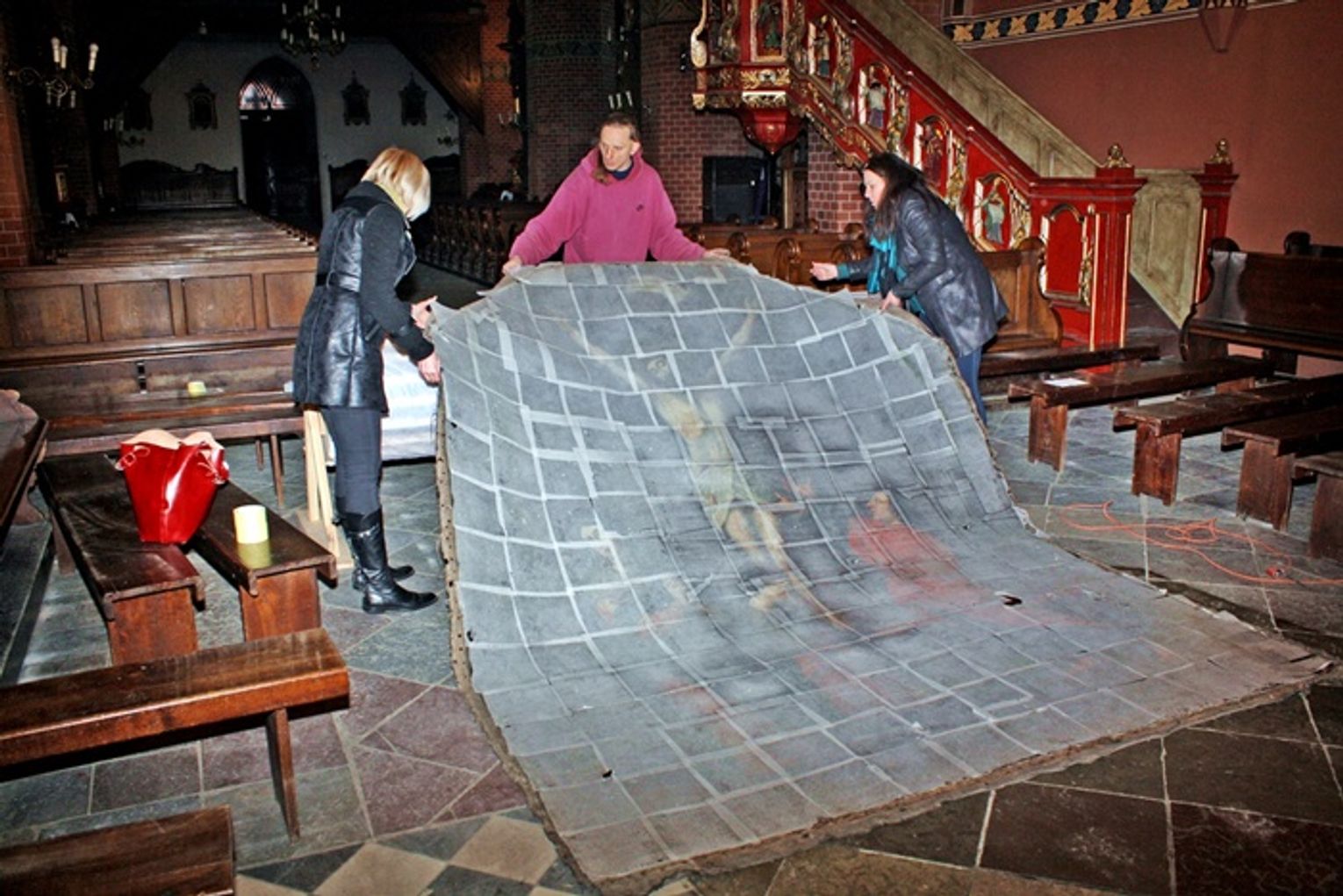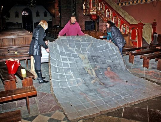 W ubiegłym tygodniu przeprowadzono operację wyjęcia obrazu z ołtarza. Konserwatorzy zdjęli płótno z blejtramu i nawinęli je na specjalny bęben. Tak zabezpieczone dzieło pojedzie teraz do pracowni konserwacji zabytków w Gdańsku. Malowidło przedstawiające ukrzyżowanie Jezusa Chrystusa pochodzi prawdopodobnie z początku XVIII wieku. Możliwe, że podczas drobiazgowej renowacji uda się określić bardziej dokładną datę powstania obrazu oraz miejsce jego pochodzenia, a może nawet i nazwisko autora.