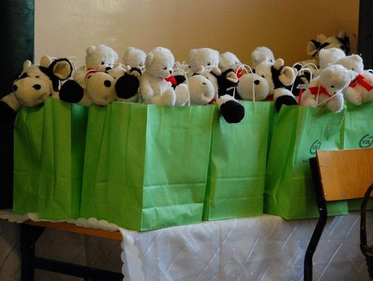 Dzieciom prezentującym się na scenie wręczono nagrody niespodzianki: plecaki, długopisy, smycze, czapeczki i portfele.
