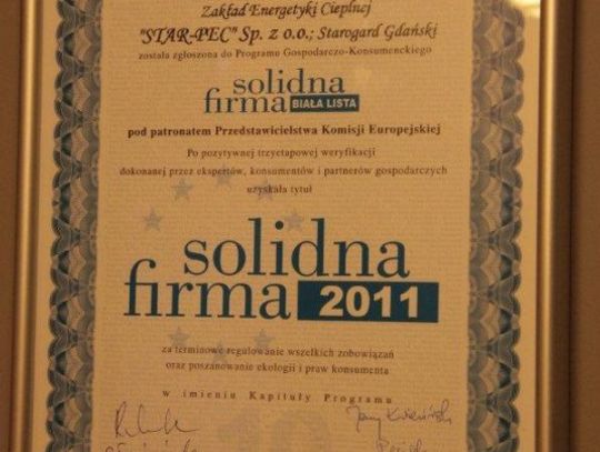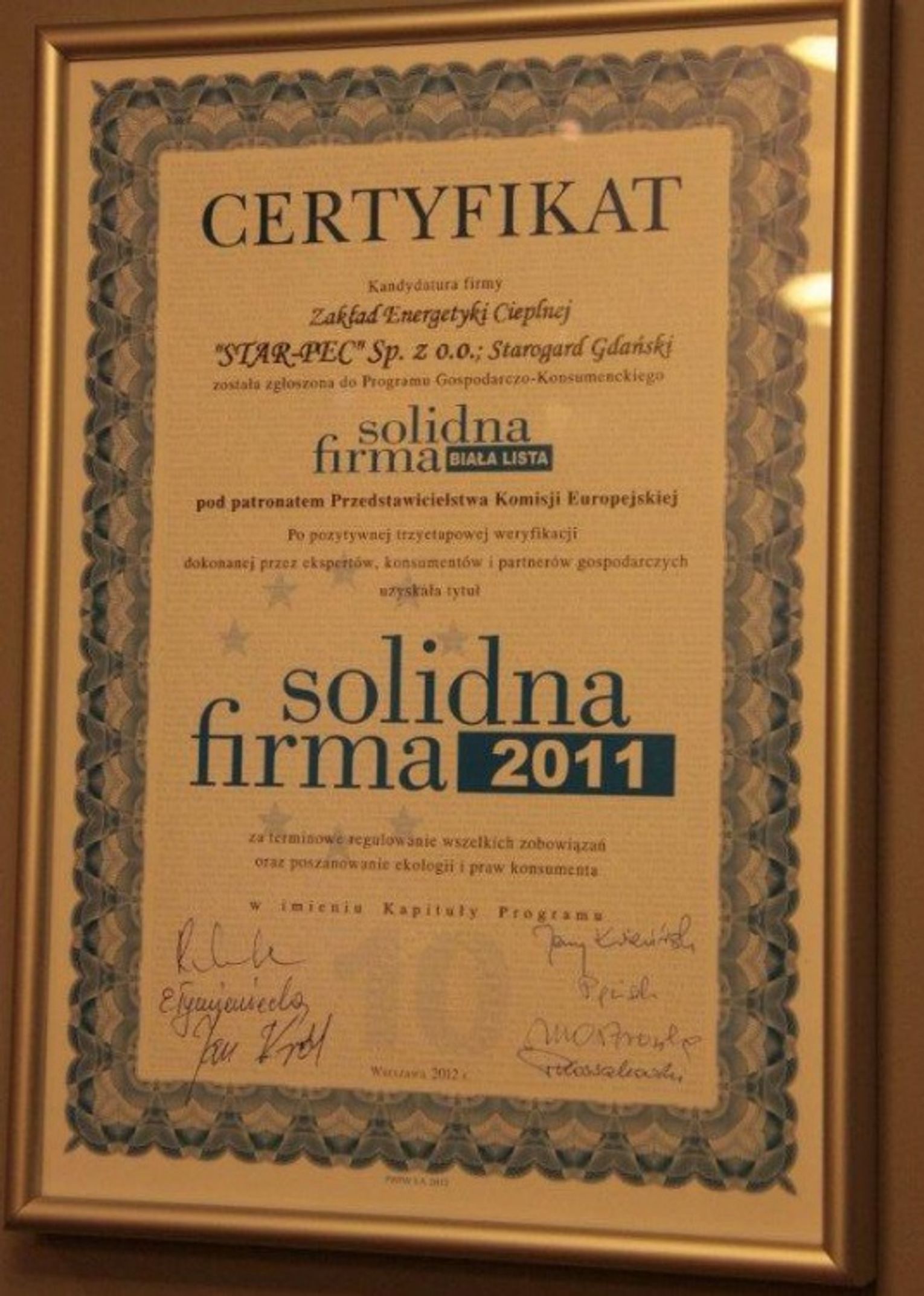 KOCIEWIE. Certyfikaty Solidna Firma 2011otrzymały trzy firmy z pow. starogardzkiego: skarszewska Firma Usługowo - Handlowa "LEMAR" W.& M. Hartuna Sp. J., GRASO - Zenon Sobiecki z Kręga i Zakład Energetyki Cieplnej "STAR - PEC" Sp. z o.o. Starogard Gd.