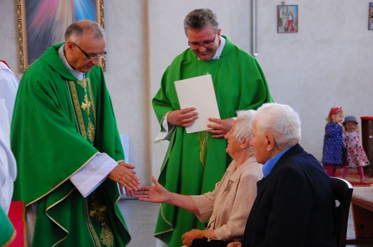 - To wielkie święto wpisuje się na trwałe w historię Waszej rodziny – mówił ks. prob. J. Buk. – Rozważając życie jubilatów można nawiązać do lotu samolotem. Pierwszy start był nieudany, następny – pilot mówi: „mam dla państwa przykra wiadomość – mamy kolejną awarię samolotu. Będziemy musieli awaryjnie lądować na lotnisku.” Wówczas wszyscy zorientowali się, że dzieje się coś złego. Był płacz i przekleństwa i tylko kierownictwo lotu panowało nad swoim spokojem. Także w życiu małżeńskim są turbulencje – mocno trzęsie. Wiele mamy dziś natychmiastowych rozejść. Wy wytrwaliście wiele dobrych lat razem. I ta uroczystość jest wyrazem dziękczynienia za tę łaskę. Niech to dobro promieniuje na Wasze dzieci, całą rodzinę i całą wspólnotę parafialną. Z całego serca życzę Wam dalszego zdrowia i by tych lat szczęścia i miłości było jak najwięcej.