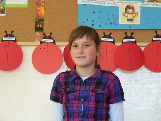 Średnia 5,18. Moje ulubione przedmioty to przyroda, matematyka i WF. Matematyka nie jest trudna i w przyszłości na maturze nie będę jej się bała. Bardzo lubię liczyć, ale... księgową nie będę. Mój pomysł na życie to zostać aktorką albo piosenkarką. Śpiewanie to moja pasja, w domu czy w szkole, słucham na przykład Eweliny Lisowskiej. Mam pieska, który się wabi Dino.