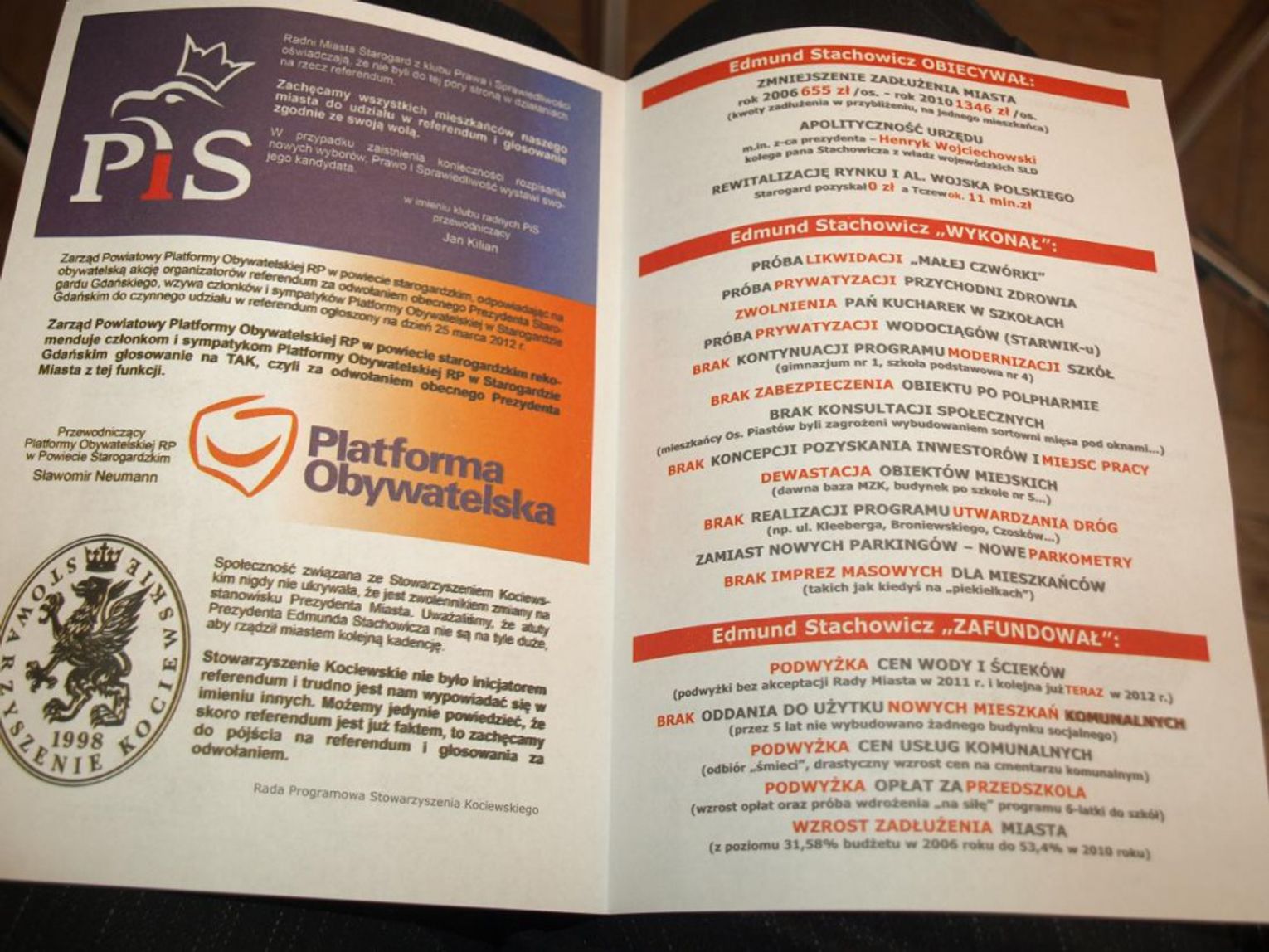 Nie ucichły jeszcze echa publikacji, które znalazły swój finał w sądzie, tymczasem w poniedziałek do skrzynek mieszkańców rozkolportowano kolejny materiał autorstwa inicjatora referendum. Na czterech stronach ulotki Marcin Wichert po raz kolejny wylicza - jego zdaniem - błędy włodarza przypominając co w przeciągu ostatnich lat prezydent obiecał, „wykonał”, a co „zafundował” mieszkańcom Starogardu Gd. Wśród argumentów za odwołaniem wymienia się próbę likwidacji „małej czwórki”, zwolnienia kucharek w szkołach, próbę prywatyzacji Star – Wik - u i przychodni zdrowia. Zdaniem inicjatora prezydent „zafundował” mieszkańcom nowe parkometry, podwyżki cen wody i ścieków, brak oddania do użytku nowych mieszkań komunalnych czy wzrost zadłużenia miasta. W ulotce znalazła się także jak to określono „niechlubna lista” płac osób zamieszkałych poza Starogardem Gd., a zatrudnionych na stanowiskach publicznych, m.in. sekretarza miasta i dyrektor MOPS.