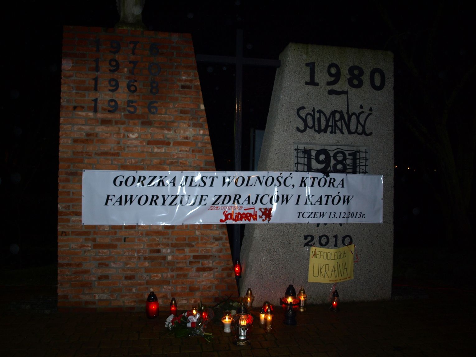 Mieszkańcy Tczewa zebrali się pod pomnikiem o godz. 16.00 oraz 17.00. Organizatorem pierwszego spotkania było stowarzyszenie „Zawsze Solidarni”, drugiego Platforma Obywatelska. W trakcie uroczystości głos zabrał m.in. założyciel Gazety Tczewskiej, która w podziemiu pełniła rolę twierdzy wolnego słowa.