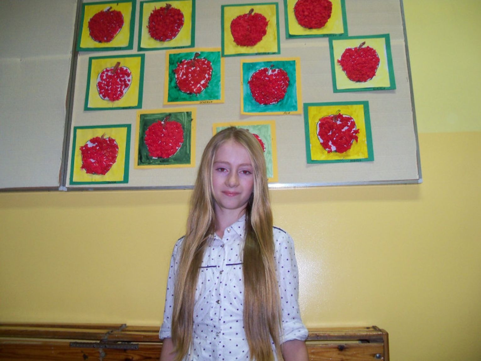 Średnia 5,1. Lubię j. polski i plastykę. Mam fajnego nauczyciela, a wszystko łatwo da się zapamiętać. Lekcje powtarzam też w domu. Biorę udział w konkursach, np. wiedzy o Fryderyku Chopinie, czy akademiach, jak ostatnio w Dzień Nauczyciela. Wraz z kolegą prowadziłam uroczystość. Chętnie przebywam na świeżym powietrzu i pomagam w domu. Interesuję się gotowaniem. Najczęściej robię słodkości, ale i przygotowałam zupę. Wolę j. angielski, bo łatwiej się wymawia. Mam kota - Mazurek, psa – Maja i królika - Tuptuś.