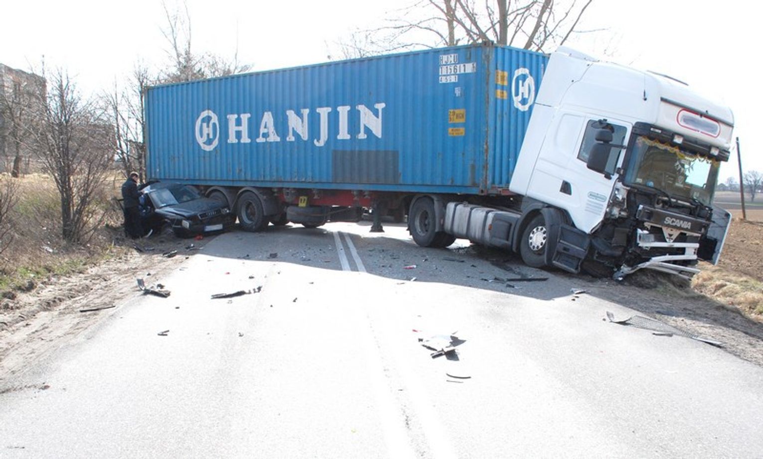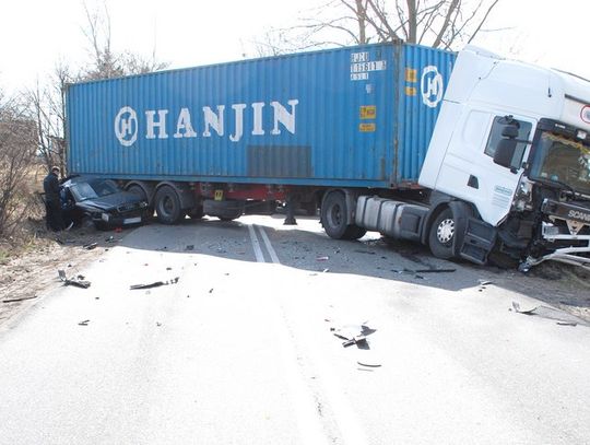 Wypadek audi z TIR-em, ranny kierowca jest w szpitalu