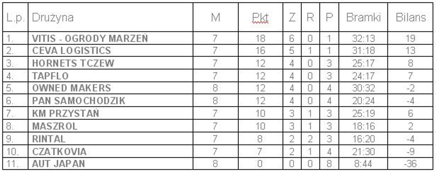 3 bramki - Krzysztof Zaradny (owned Makers), Marcin Czarnecki (Rintal), Dariusz Frost (VITIS – Ogrody Marzeń), Przemysław Zawoliński (owned Makers), Dariusz Kończyk (Pan Samochodzik), Maciej Megier (Hornets Tczew), Tomasz Hausmann (VITIS – Ogrody Marzeń), Sławomir Furmanek (Maszrol), Karol Kowalski (Hornets Tczew), Marcin Latoszewski (CEVA Logistics);
