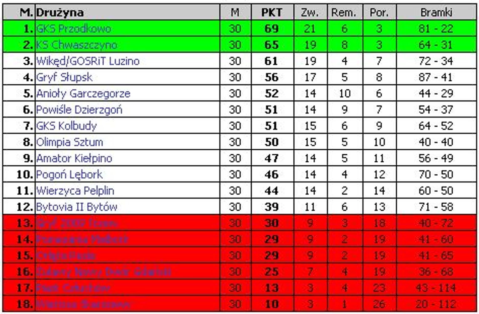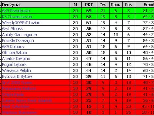 Z IV ligi spadnie w zależności od rozstrzygnięć w III lidze 6, 7 bądź 8 zespołów. Gryf jest obecnie 6 od końca, jednak do wyprzedzającej go Bytovii traci już 9 pkt. Do zakończenia rozgrywek pozostały tylko cztery kolejki. W tej sytuacji tczewianie muszą liczyć nie tylko na siebie, ale także potknięcia rywali z Bytowa oraz taki układ III ligi, który sprawi, że spadnie nie więcej niż 6 drużyn (na razie z IV ligą pożegnały się Wietcisa, Piast i Żuławy). W sobotę zwycięstwo przed własną publicznością odniosła Wierzyca. Dzięki dopisaniu 3 punktów do dotychczasowego dorobku, pelplinianie raczej mogą być spokojni o utrzymanie. W międzyczasie do IV ligi awansował zespół KP Starogard. Blisko awansu jest także Centrum Pelplin. Wiele wskazuje na to, że w przyszłym sezonie Pelplin w IV lidze będą reprezentowały dwa zespoły, a Tczew ani jeden.