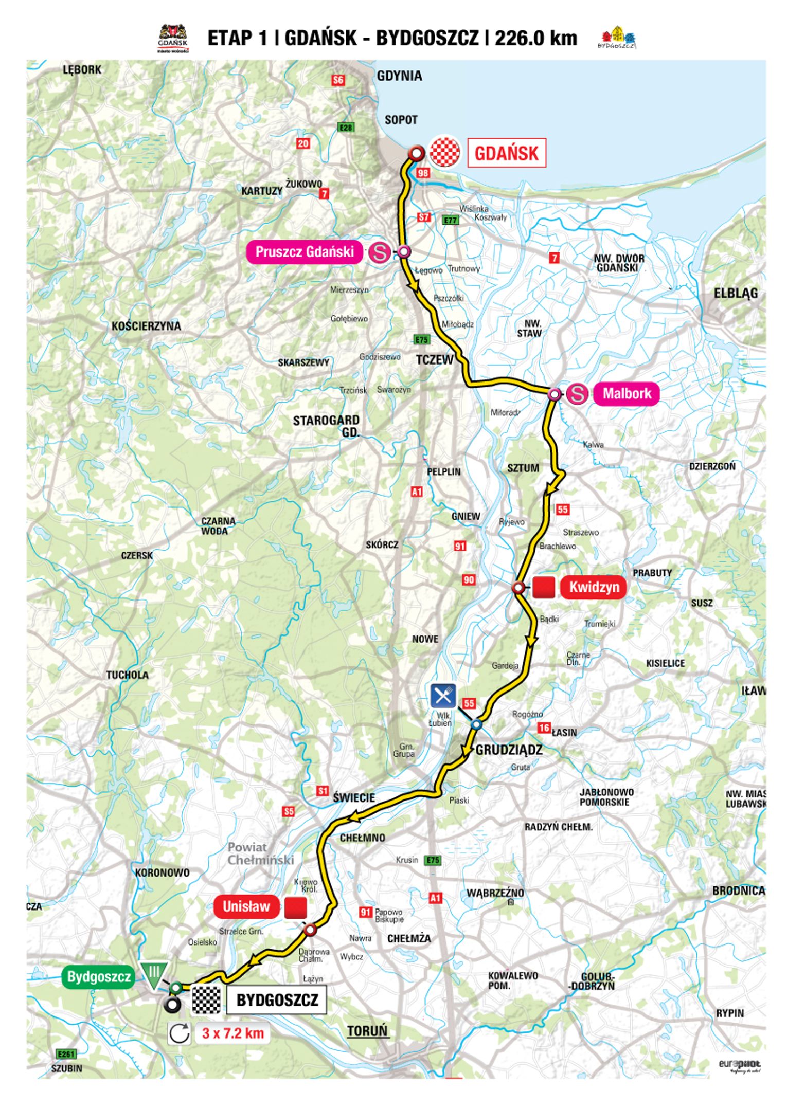 Ruch kołowy na odcinku Aleja Solidarności do ronda Jana Pawła II, ul. Wojska Polskiego, 30 Stycznia, Bałdowska i jej przedłużenie do drogi krajowej 22 oraz droga krajowa nr 22 w kierunku Malborka zostanie wstrzymany od godziny 12.40 dla ruchu wzdłuż trasy przejazdu oraz od godziny 13.10 na drogach poprzecznych – przecinających trasę wyścigu.