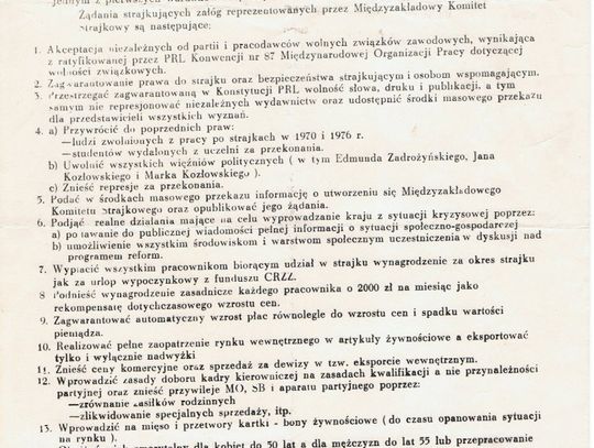 Roman Bojanowski: Postulaty. W PKS Tczew mieliśmy na początku swoje. Miałem nawet zaszczyt wręczyć je osobiście jakiemuś partyjniakowi w tzw. Białym Domku. Nawet nie ruszył d... z krzesła. Przeczytał, położył na biurku i zapytał czy mamy (było nas trzech) jeszcze coś do dodania. Powiedziałem, że nic i wyszliśmy. Potem PKS wpisał się do MKS przy Stoczni w Gdańsku i ich postulaty stały się naszymi. Tych gdańskich, jak wiemy, było 21. Niektóre w dzisiejszych realiach są folklorem i u osób nie znających tamtych realiów mogą wzbudzać uśmiech. Na przykład postulat 11. Dzisiaj nikt nie potrzebuje kartek na mięso. Niektóre zrealizowano -znowu przykład- powiadomiono opinię publiczną o powstaniu Międzyzakładowego Komitetu Strajkowego. Niektóre natomiast nie tylko, że nie są zrealizowane ale wręcz pogwałcone i wypaczone, chociażby postulat 14 -"Obniżyć wiek emerytalny dla kobiet do 50 lat, a dla mężczyzn do lat 55 lub [zaliczyć] przepracowanie w PRL 30 lat dla kobiet i 35 lat dla mężczyzn bez względu na wiek". Mamy (dla kobiet) 17 lat więcej niż zakładał postulat, i -co ważne- przyjęty w porozumieniu podpisanym przez obie strony 31 sierpnia. Tablice, na których spisano postulaty, zostały uznane przez Międzynarodowy Komitet Doradczy Programu UNESCO „Pamięć Świata” za jeden z najważniejszych dokumentów XX wieku i decyzją Sekretarza Generalnego UNESCO z 16 października 2003 wpisano je na Światową Listę Dziedzictwa Kulturowego UNESCO. Postulat 14 powinien być wpisany jako przykład hipokryzji władz w stosunku do własnych obywateli i ostrzeżenie -ile warte jest porozumienie z władzą. Z władzą nie podpisuje się porozumień, a taką, która kpi ze społeczeństwa należy usuwać.