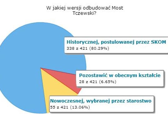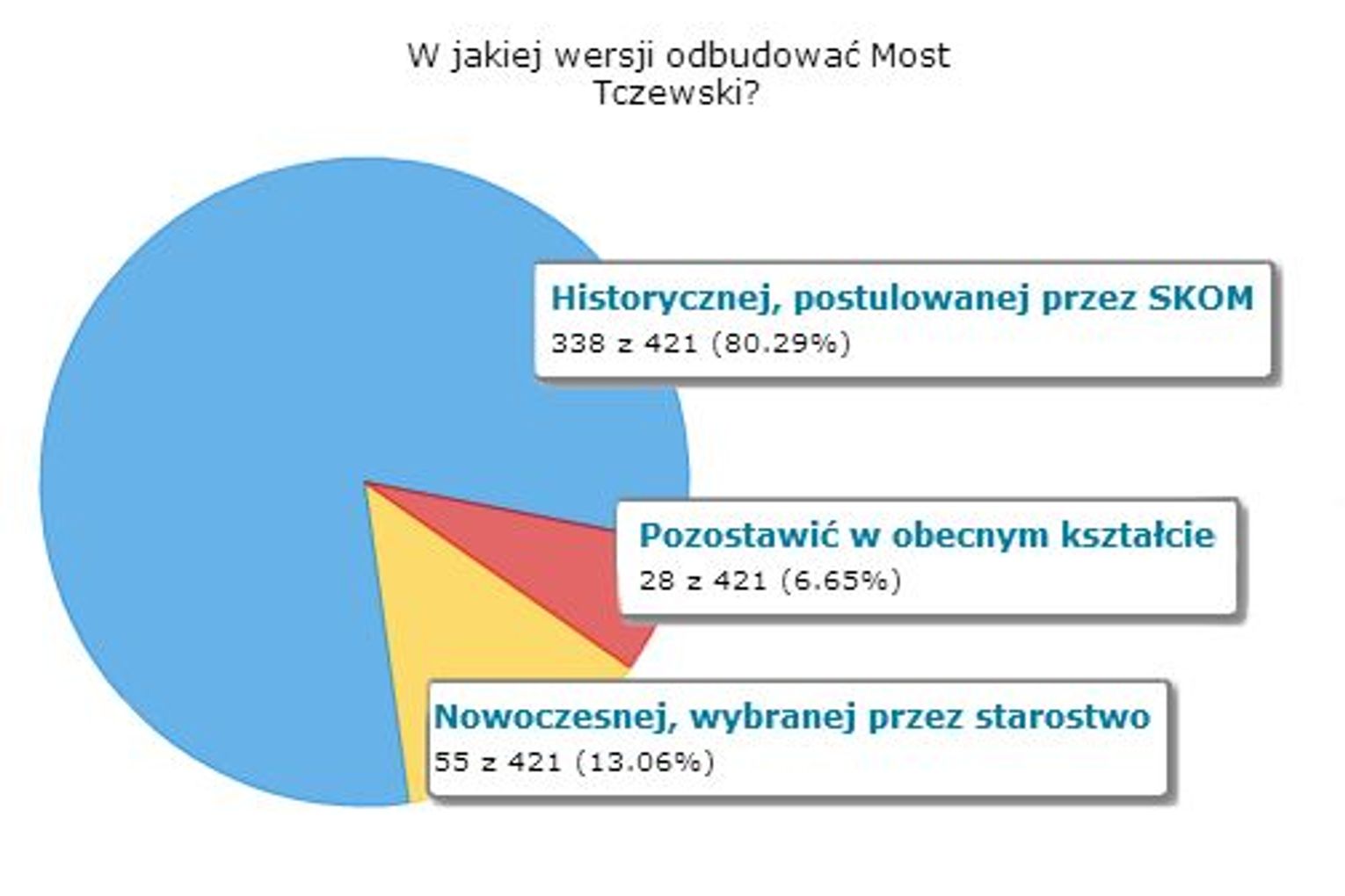 Czy wariant historyczny rzeczywiście ma tak duże poparcie mieszkańców czy też popiera go tylko garstka społeczników? Kilka dni temu postanowiliśmy sprawdzić to w sondzie. W dniach od 29 sierpnia do 2 września swój głos oddało ponad 420 internautów. 80 proc. z nich opowiedziało się za wariantem historycznym postulowanym przez SKOM, 13 proc. za wariantem nowoczesnym wybranym przez tczewskie starostwo, z kolei 7 proc. głosujących chce, aby most został zakonserwowany i pozostawiony w formie obecnej.