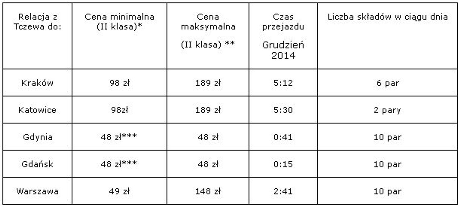 Promocyjne ceny na pierwszy rzut oka wyglądają atrakcyjnie, ale czy na pewno? W chwili obecnej za przejazd pociągiem TLK z Tczewa do Warszawy zapłacimy 60 zł, z kolei za pociąg Express InterCity 87 zł. W przypadku Pendolino najtańszy bilet będzie kosztował 49 zł, ale po wyczerpaniu tej puli wszystkie kolejne ceny będą przekraczać 100 zł. W nowym rozkładzie oprócz dziesięciu par połączeń Pendolino na trasie Tczew-Warszawa będzie zaledwie jedno połączenie Express InterCity i dwa TLK. Mała ilość tanich połączeń nie zmienia jednak faktu, że Pendolino zawiezie nas z Tczewa do Warszawy w zaledwie 2 godz. i 41 min. (do niedawna ok. 5-6 godzin, przed remontem ponad 3), a do Krakowa w nieco ponad 5 godzin (do niedawna 8-10 godzin).