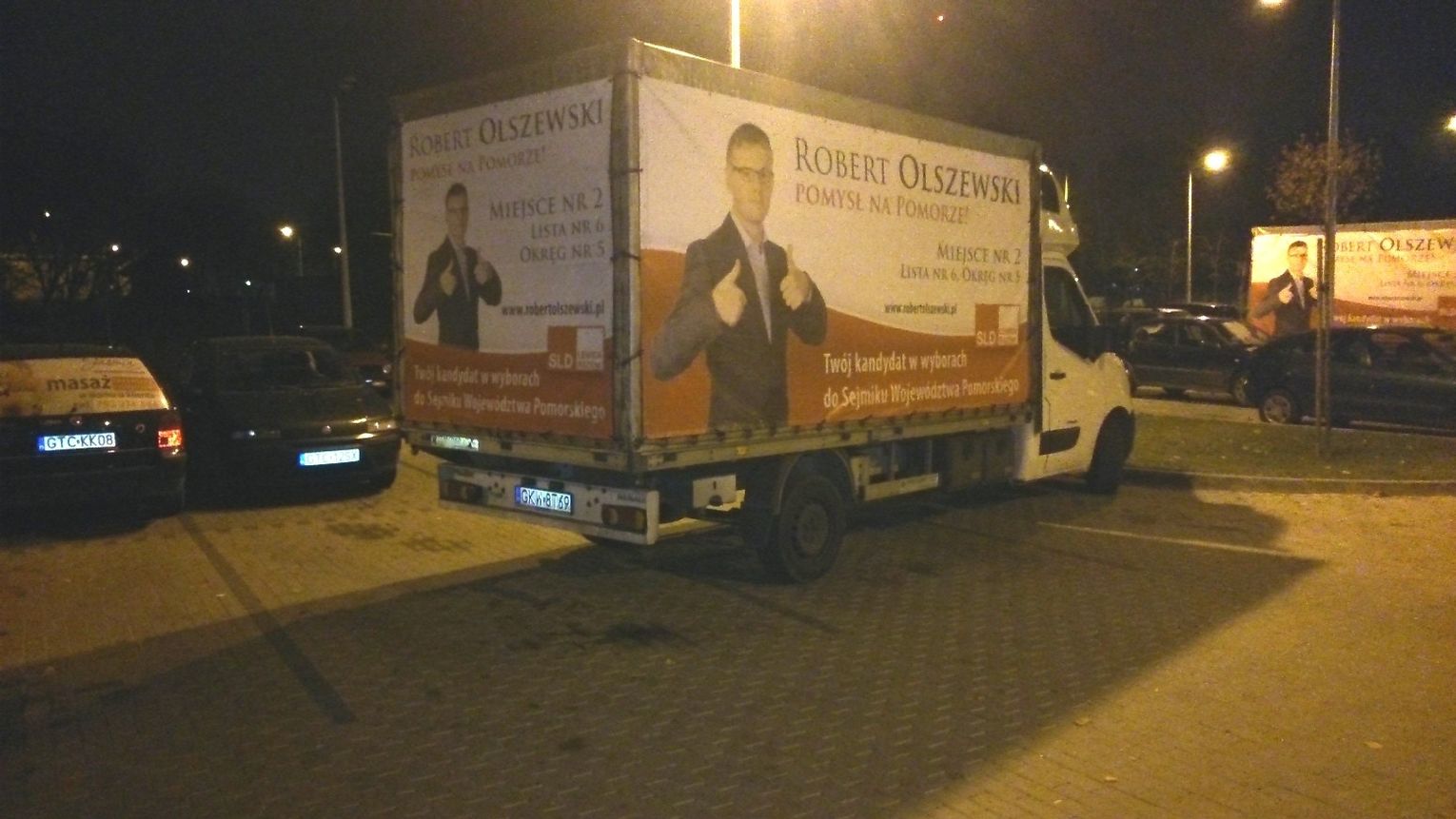 Dwa dni przed wyborami do naszej Redakcji zgłosił się Czytelnik (także w imieniu innych zirytowanych kierowców), według którego auta dostawcze kandydata do Sejmiku Wojewódzkiego z listy SLD Roberta Olszewskiego zaparkowane były pod Galerią Kociewską w niedozwolonych miejscach, łamiąc przepisy - jeden samochód zajmował trzy miejsca parkingowe, przez co uniemożliwił parkowanie innym przyjezdnym.