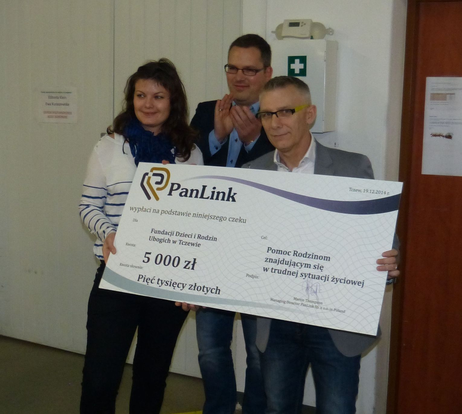 Uroczyste wręczenie czeków dla dwóch organizacji z Tczewa odbyło się w piątek 19 grudnia. Zarówno Fundacja Dzieci i Rodzin Ubogich oraz Świetlica Środowiskowa Polskiego Komitetu Pomocy Społecznej otrzymały po 5 tys. zł. Wręczenia czeków dokonał Martin Thompson, dyrektor generalny oraz członek zarządu spółki PanLink.
