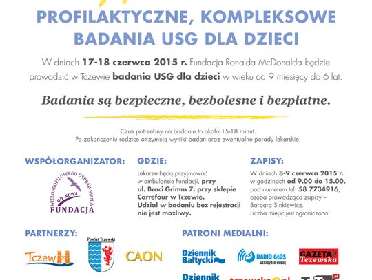 Aby wziąć udział w badaniu USG należy zapisać dziecko, dzwoniąc w dniach 8,9 czerwca w godzinach 9.00 – 15.00 pod numer: tel. 58 7734916