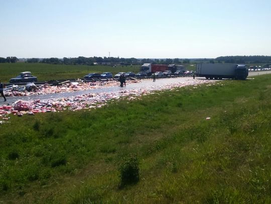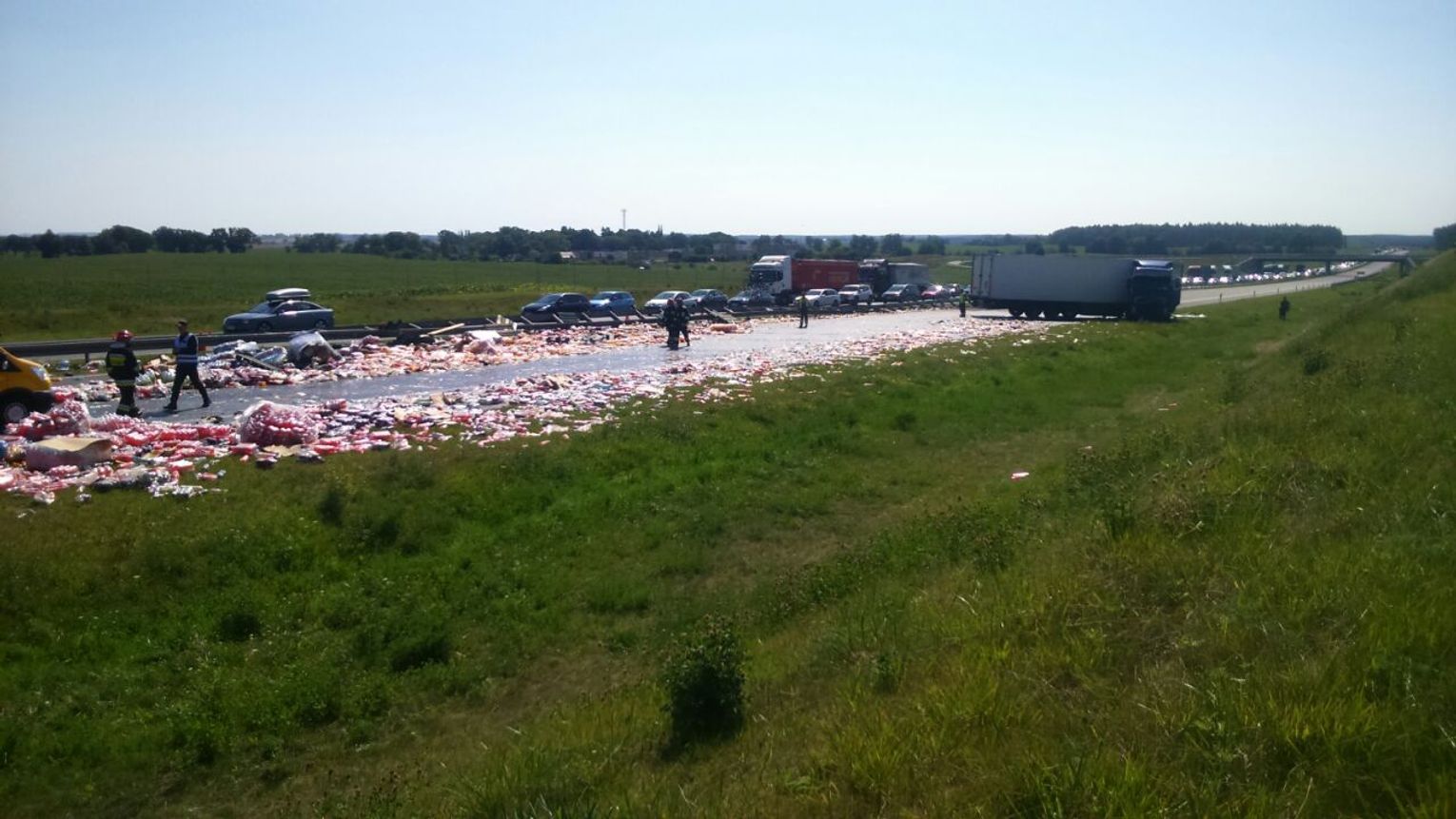 Samochód ciężarowy podczas hamowania uderzył w barierki ochronne co spowodowało wysypanie się przeciwny pas butelek. Następnie na leżące butelki najechał kolejny samochód ciężarowy w który uderzył samochód osobowy.