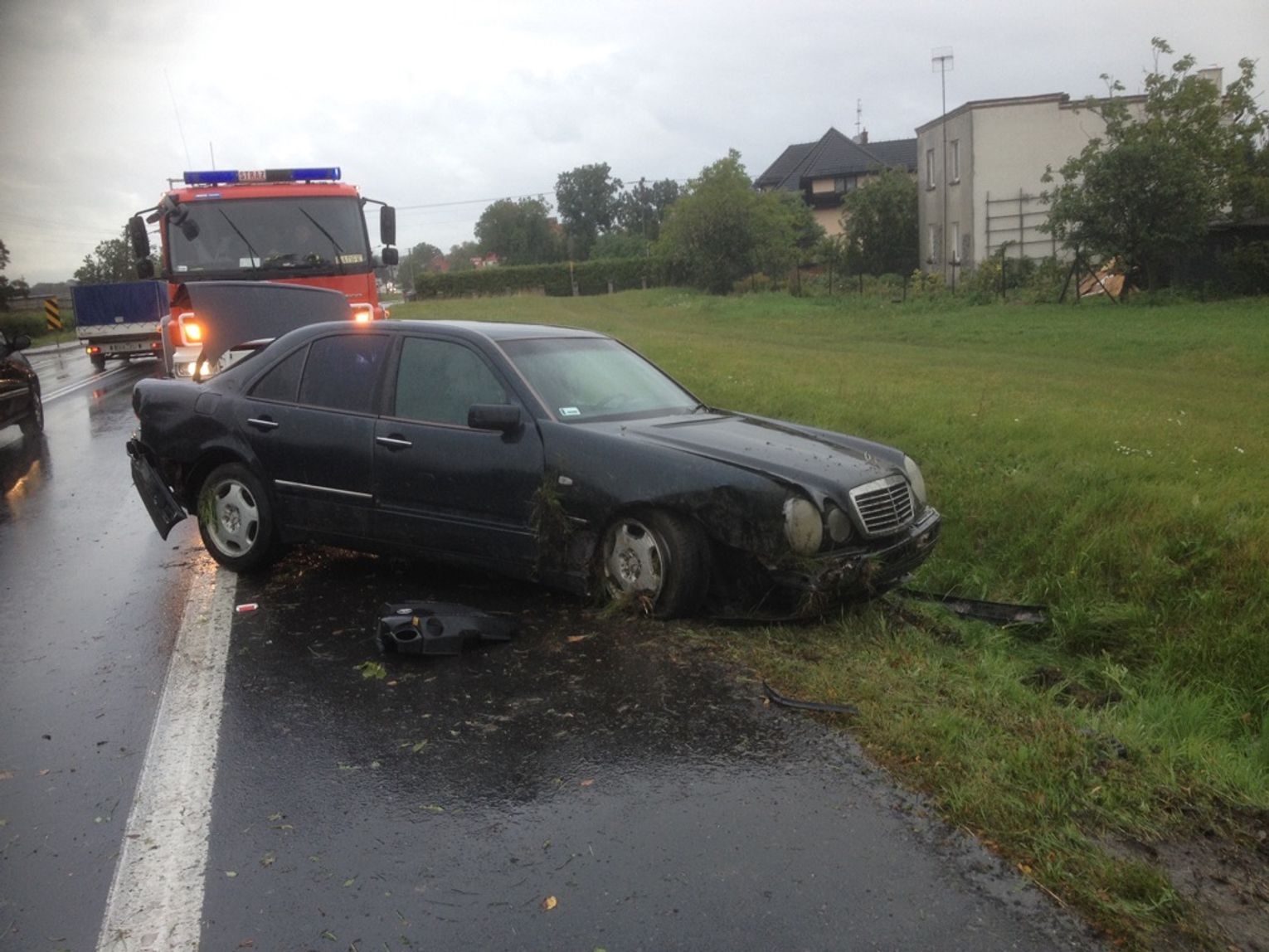 Samochód marki mercedes wjechał do rowu. Poszkodowana osoba została zabrana przez zespół ratownictwa medycznego do szpitala. Ruch na „jedynce” odbywa się wahadłowo.
