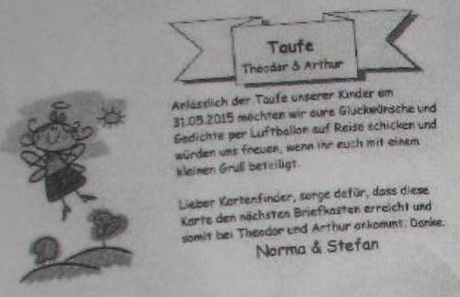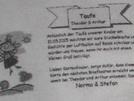 Zaciekawiony niecodziennym widokiem, podszedł do balona i zauważył, że do końcówki przywiązano pocztówkę. Na niej znajdował się napis w języku niemieckim oraz adres z Halle (okolice Lipska).