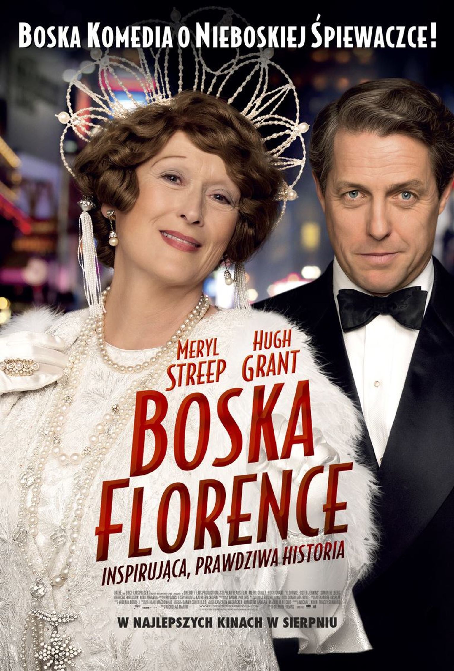 Za reżyserię filmu odpowiedzialny jest Stephen Frears, który w ostatnich latach został specjalistą, jeśli chodzi o ekranizacje biografii. W roku 2006 nakręcił „Królową” obrazującą życie brytyjskiej władczyni Elżbiety II (6 nominacji do Oscara, 1 statuetka zdobyta) a w 2013 do kin trafiła „Tajemnica Filomeny” opowiadająca poruszającą historię kobiety poszukującej swojego syna, którego w młodości musiała oddać do adopcji (4 nominacje do Oscara). Teraz Frears zabrał się za prawdziwą historię Florence Foster Jenkins, amerykańskiej sopranistki, znanej jako „najgorsza śpiewaczka świata”, która pomimo całkowitego braku talentu wokalnego cieszyła się dużą popularnością a na jej koncerty widownia zawsze meldowała się w komplecie wypełniającym sale. Wszystko przez jej urok osobisty, umiejętność dostarczania rozrywki i…niewątpliwie istotne zaplecze finansowe, jakie zapewniała jej fortuna odziedziczona po ojcu-bankierze. Oprócz wspomnianych nazwisk Streep, Granta i Frears’a do obejrzenia filmu zachęcają znakomite recenzje krytyków zza oceanu (92% rekomendacji na opiniotwórczym portalu branżowym rottentomatoes.com) oraz fantastyczna ścieżka dźwiękowa do „Boskiej Florence”, za którą odpowiedzialny jest francuski geniusz kompozytorski, Alexandre Desplat („Jak zostać królem”, „Operacja Argo”, „Grand Budapest Hotel”).